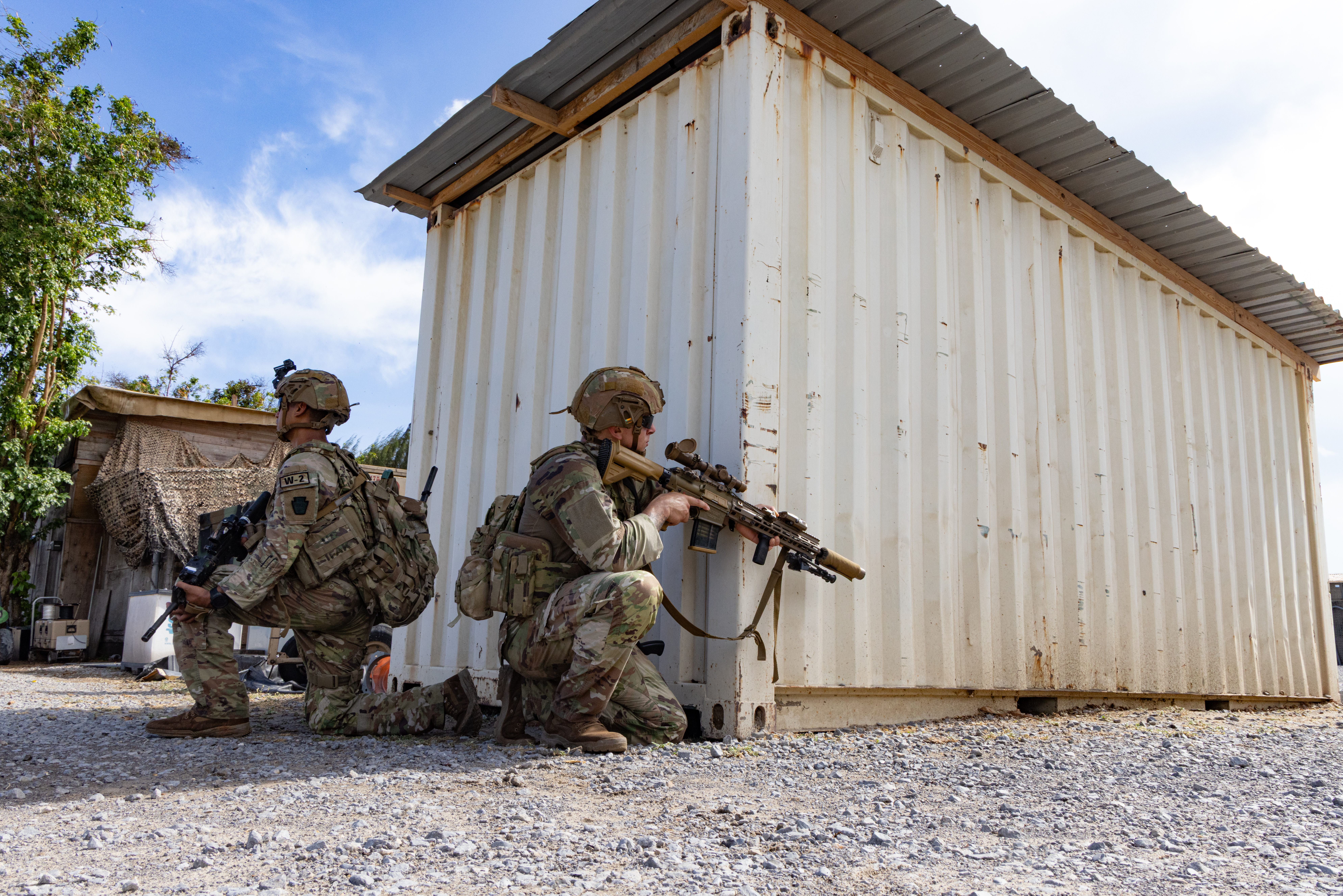 U.S. Army Soldiers in the East Africa Response Force assigned to Task Force Associator secure a position for a Casualty Clearance drill during an Outstation Crisis Response Exercise in Manda Bay, Kenya, March 27, 2025. The Combined Joint Task Force - Horn of Africa leads OSCREs to practice rapid deployment, provide security reinforcement support and facilitate combat casualty care training in order to improve lethality and readiness. (U.S. Army photo by Spc. Mitch Munn)