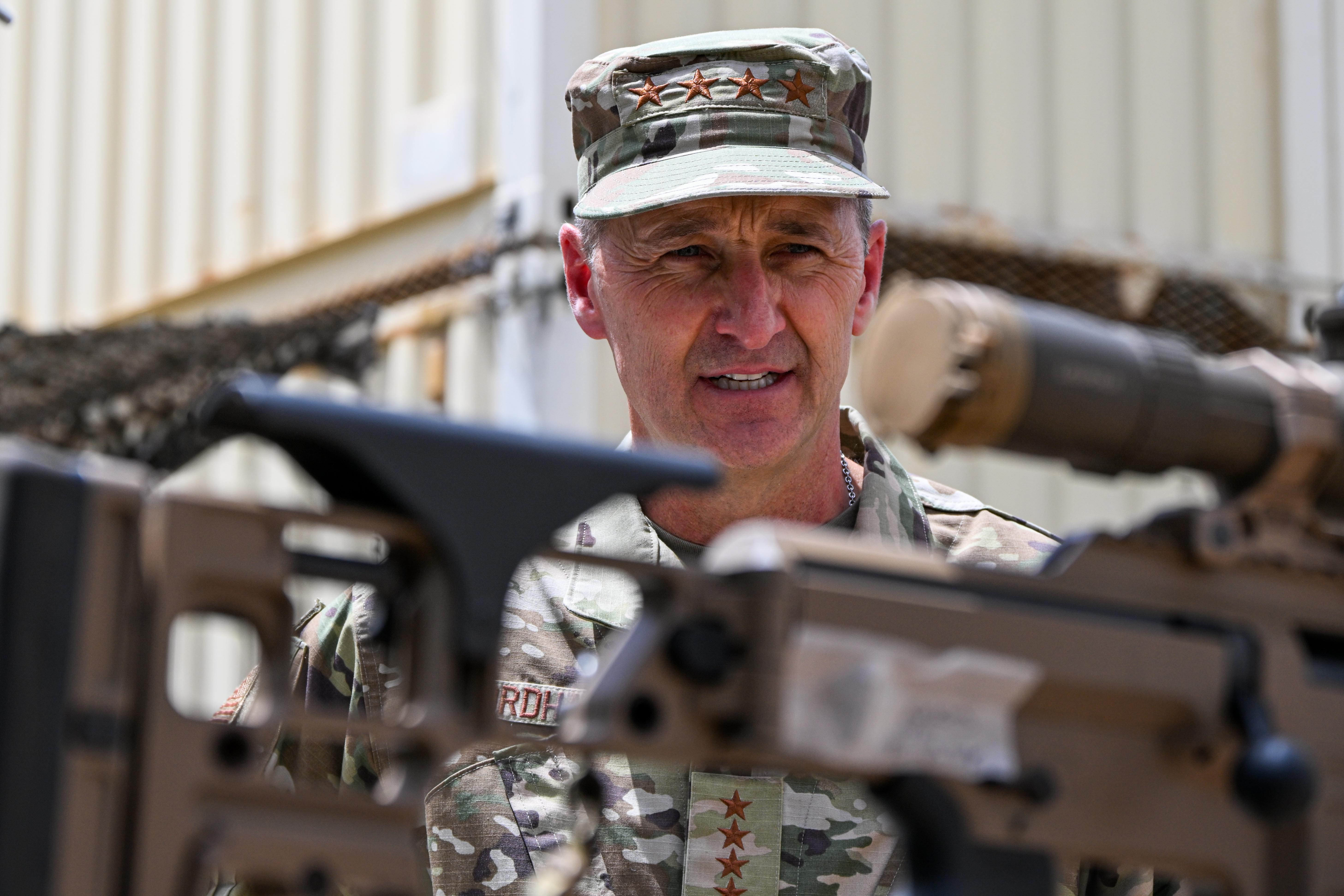 U.S. Air Force Gen. Steven S. Nordhaus, chief of the National Guard Bureau, tours facilities of Task Force Associator at Camp Lemonnier, Djibouti, May 30, 2025. The tour showcased the operational abilities of TFAS, reviewing various weapon systems and gear. (U.S. Air Force photo by Airman 1st Class Synsere Howard)