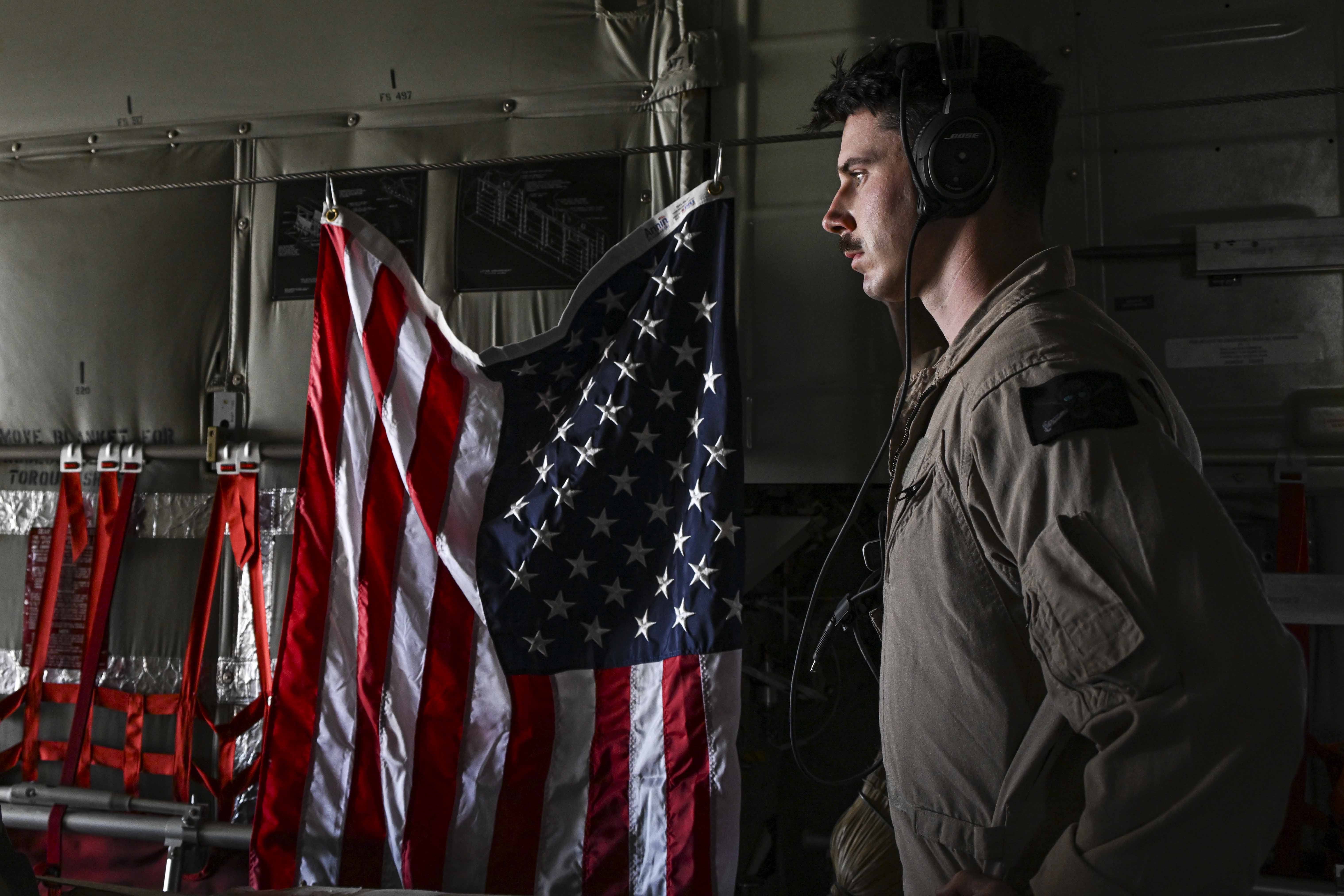 U.S. Marine Corps Capt. Sion Harrington, KC-130J Super Hercules pilot, oversees the unloading of cargo at Cooperative Security Location, Kismayo, Somalia, June 2, 2025. Combined Joint Task Force - Horn of Africa seeks continuous improvement in the locations of responsibility, enabling focus on delivering the mission of enhancing regional security. (U.S. Air Force photo by Senior Airman Joseph Bartoszek)
