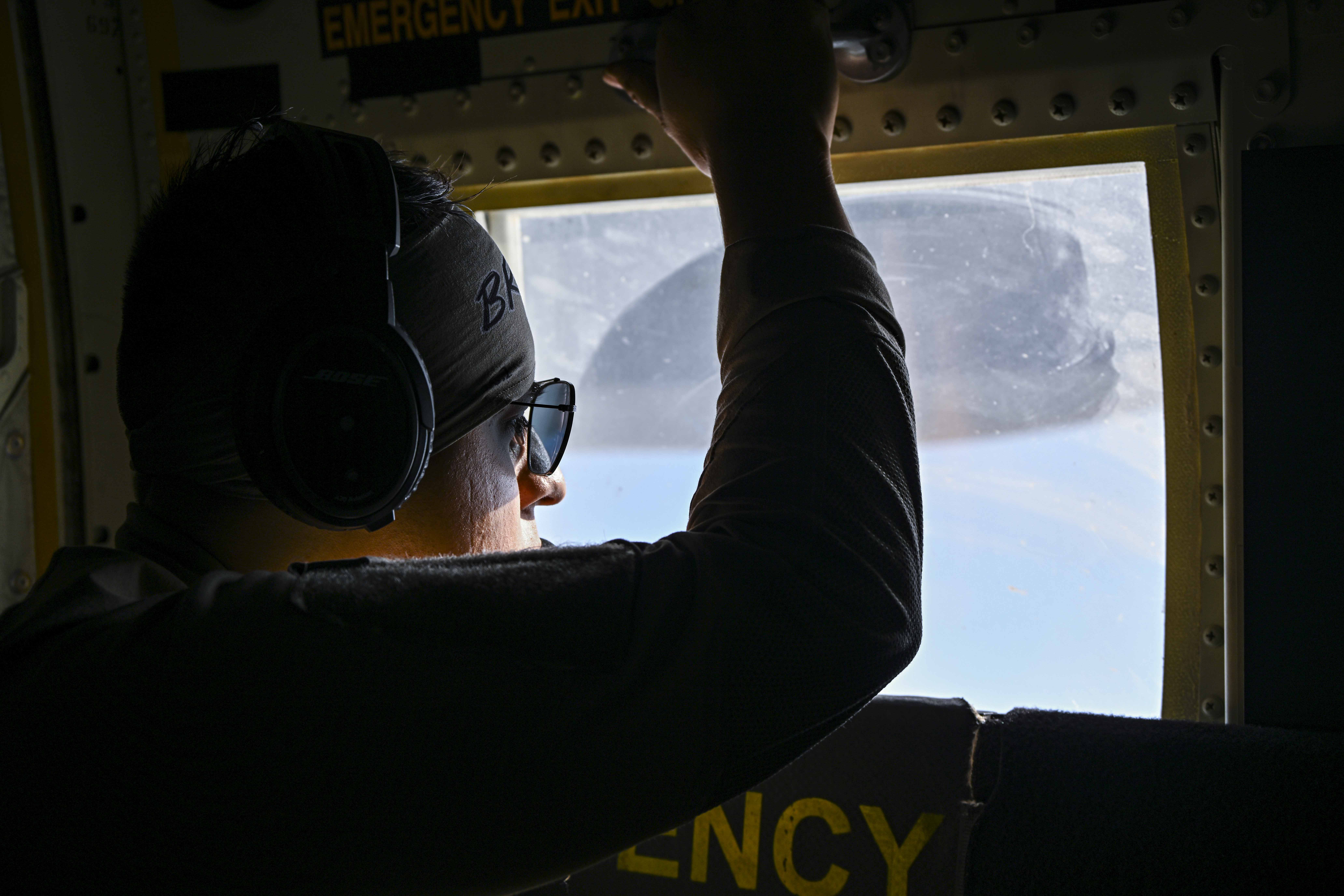 U.S. Marine Corps Sgt. Jonathan Leon, Marine Medium Tiltrotor Squadron (VMM) 161 (Reinforced) KC-130J Super Hercules loadmaster, monitors an aerial refueling over East Africa, June 2, 2025. VMM-161 (REIN) plays a vital role in sustaining operational reach throughout East Africa. (U.S. Air Force photo by Senior Airman Joseph Bartoszek)