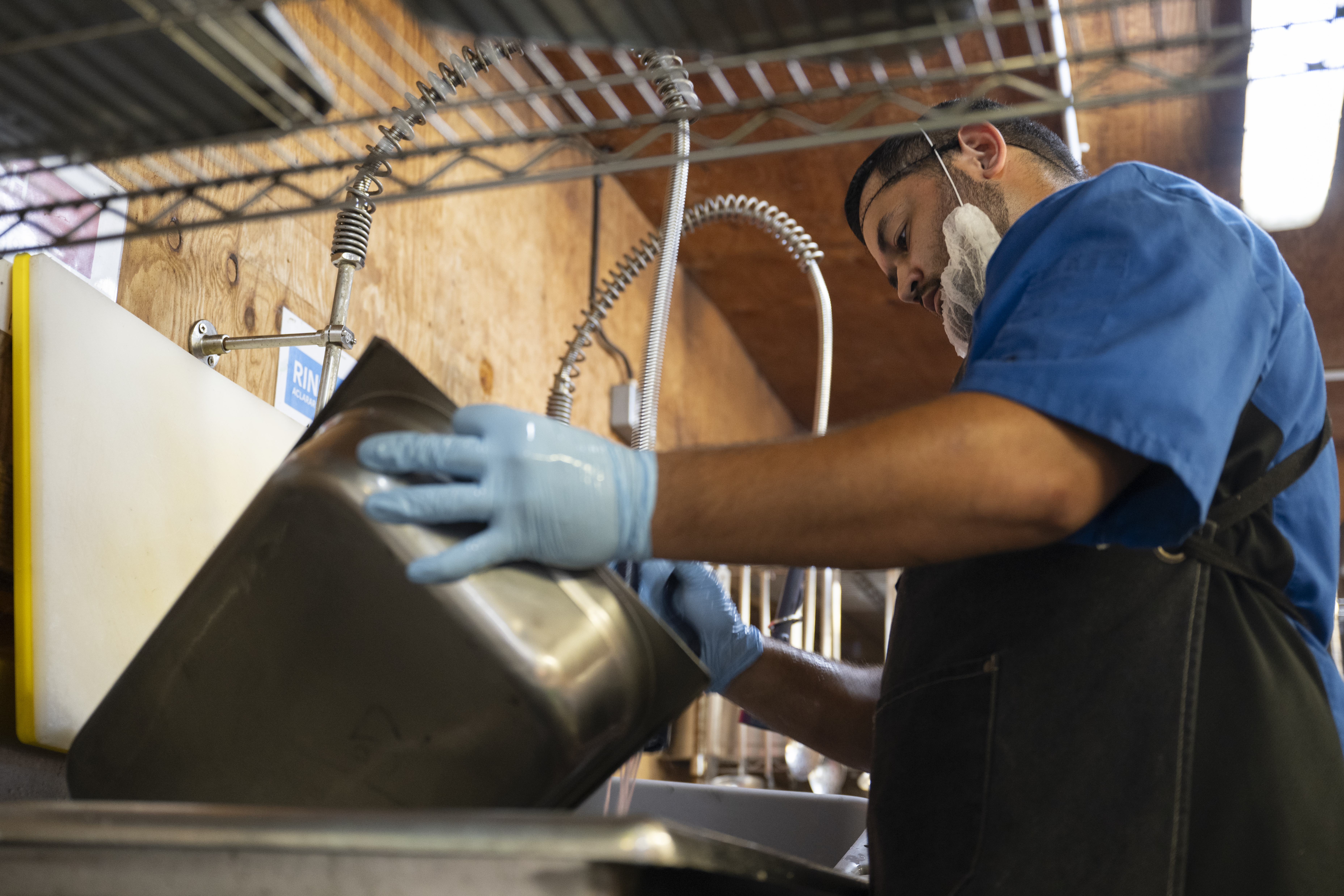 Vincent Kiluwe, Cooperative Security Location Kismayo contractor, cleans dishes at CSL Kismayo, Somalia, May 21, 2025. Food service operations, which encompass sourcing, preparing, and distributing meals, are a core part of sustainment services, ensuring service members meet the nutritional needs necessary to progress Combined Joint-Task Force Horn of Africa initiatives. (U.S. Air Force photo by Staff Sgt. Marcus Hardy-Bannerman)