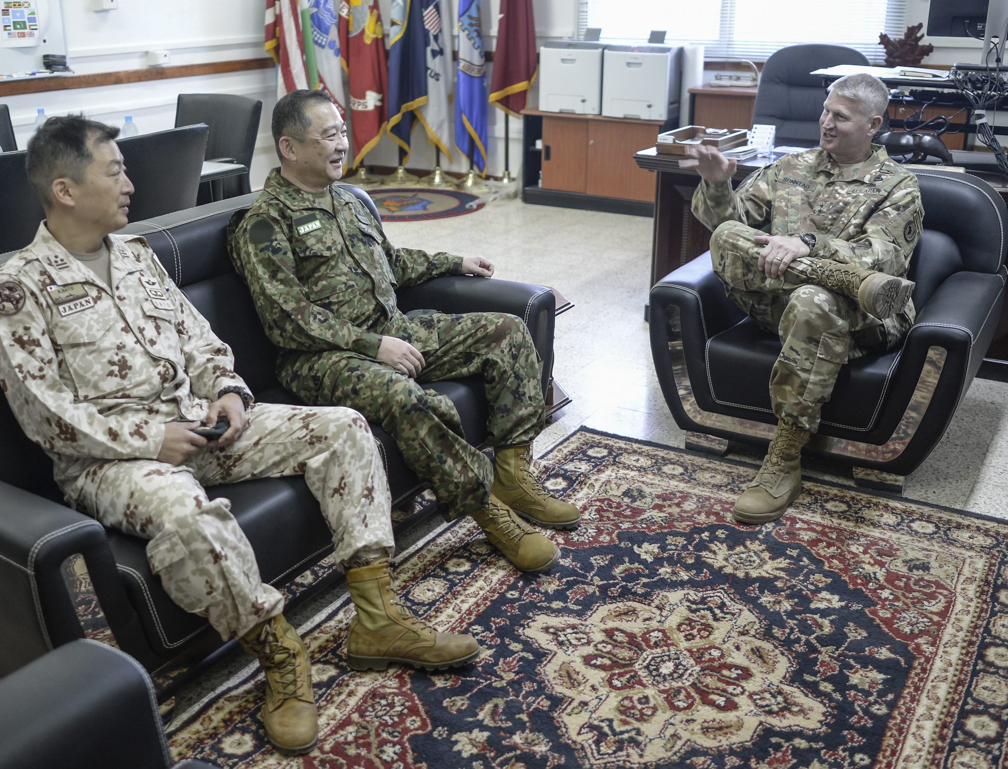 Lt. Gen. Goro Yuasa, vice chief of the Joint Staff of the Japan GroundSelf-Defense Forces meets with U.S. Army Major Gen. Kurt Sonntag,commander, Combined Joint Task Force-Horn of Africa, on his visit toCamp Lemonnier Jan. 14, 2017. Lt. Gen. Yuasa met with U.S. officials at Camp Lemonnier to further relations between Japan and its partner nations in the Horn of Africa. (U.S. Air National Guard photo by Staff Sgt. Christian Jadot)