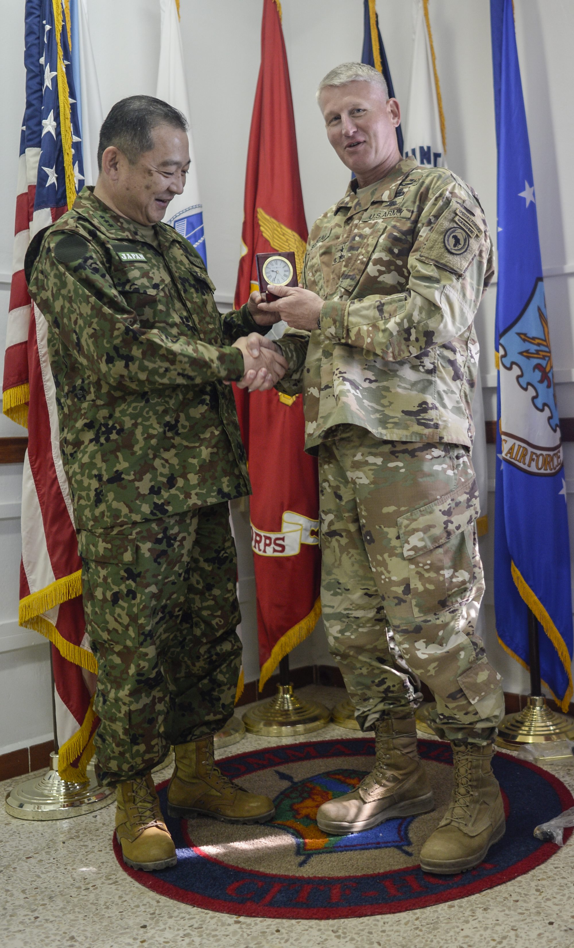 U.S. Army Major Gen. Kurt Sonntag, commander, Combined JointTask Force-Horn of Africa, presents Lt. Gen. Goro Yuasa, vice chief of the Joint Staff of the Japan Ground Self-Defense Forces with a token of appreciation at the conclusion of the Japanese visit to Camp Lemonnier, Jan. 14, 2017. Lt. Gen. Yuasa met with U.S. officials at Camp Lemonnier to discuss issues of mutual interest such as security and stability in the region. (U.S. Air National Guard photo by Staff Sgt. Christian Jadot)