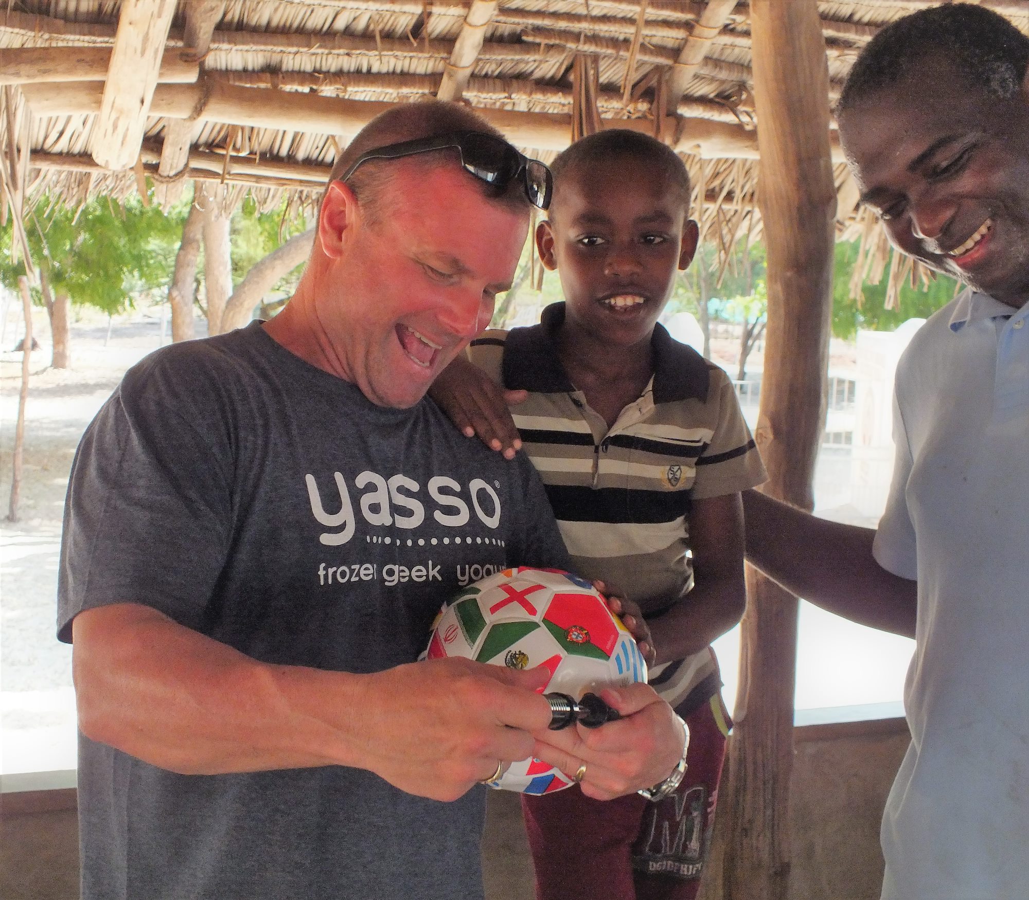U.S. Army Chaplain (CPT) Donald A. Mooney, Combined Joint Task Force-Horn of Africa (CJTF-HOA) Religious Affairs, and U.S. Navy Petty Officer 1st Class Joseph Pendantonga, Chaplain’s Assistant, CJTF-HOA Religious Affairs, pump up a soccer ball to distribute at the Anidan Children’s House in Lamu, Kenya Dec. 23, 2016. U.S. Navy Seabees and CJTF-HOA Religious Affairs personnel are assigned to Kenya to assist with repairs and construction efforts at the Anidan Children’s Home. (Courtesy Photo)