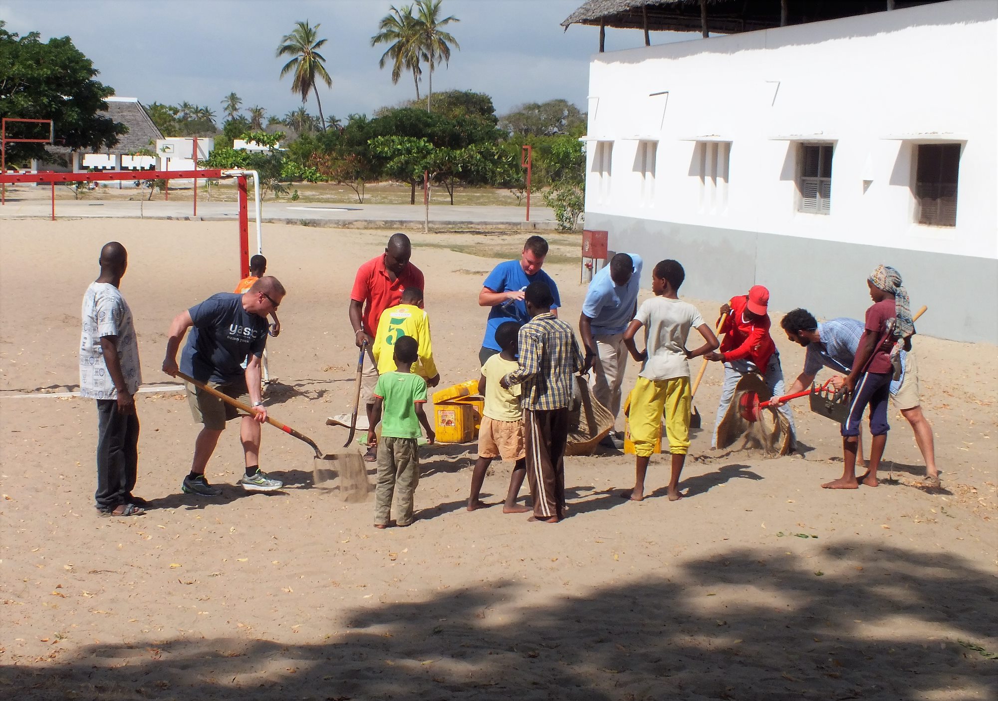 While children look on, Combined Joint Task Force-Horn of Africa (CJTF-HOA)Religious Affairs personnel assist U.S. Navy Seabees with flattening the ground prior to construction efforts at the Anidan Children’s House in Lamu, Kenya Dec. 23, 2016. U.S. Navy Seabees and CJTF-HOA Religious Affairs personnel are assigned to Kenya to help with repairs to the Anidan Children’s Home. (Courtesy Photo)
