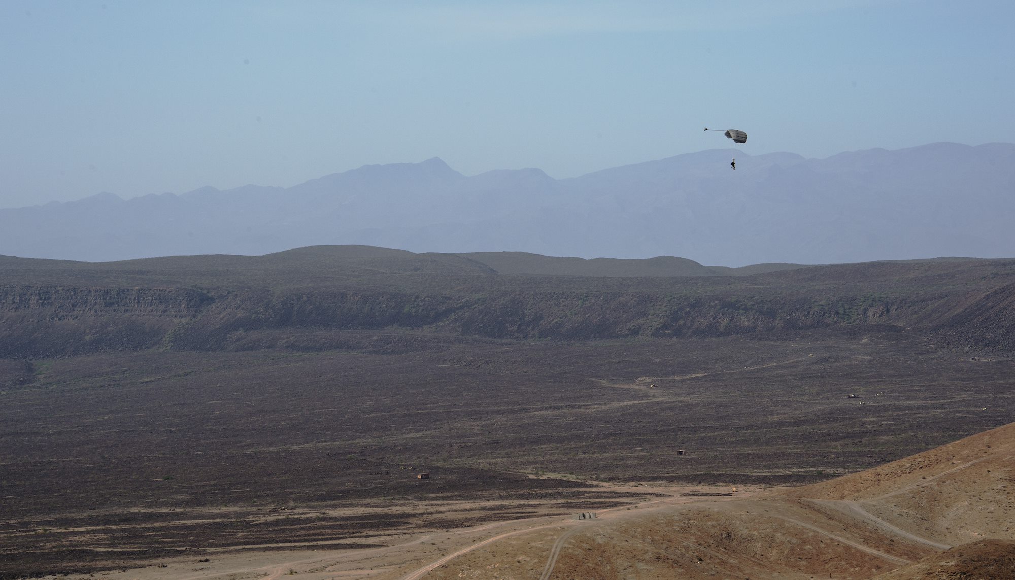 A French military member parachutes onto the simulated battlefield during the French live fire demonstration near Arta Plage, Djibouti, Jan. 14, 2017. Militaries use parachutes to allow soldiers to enter battlefields from the air that are inaccessible by other means. (U.S. Air National Guard photo by: Staff Sgt. Christian Jadot)