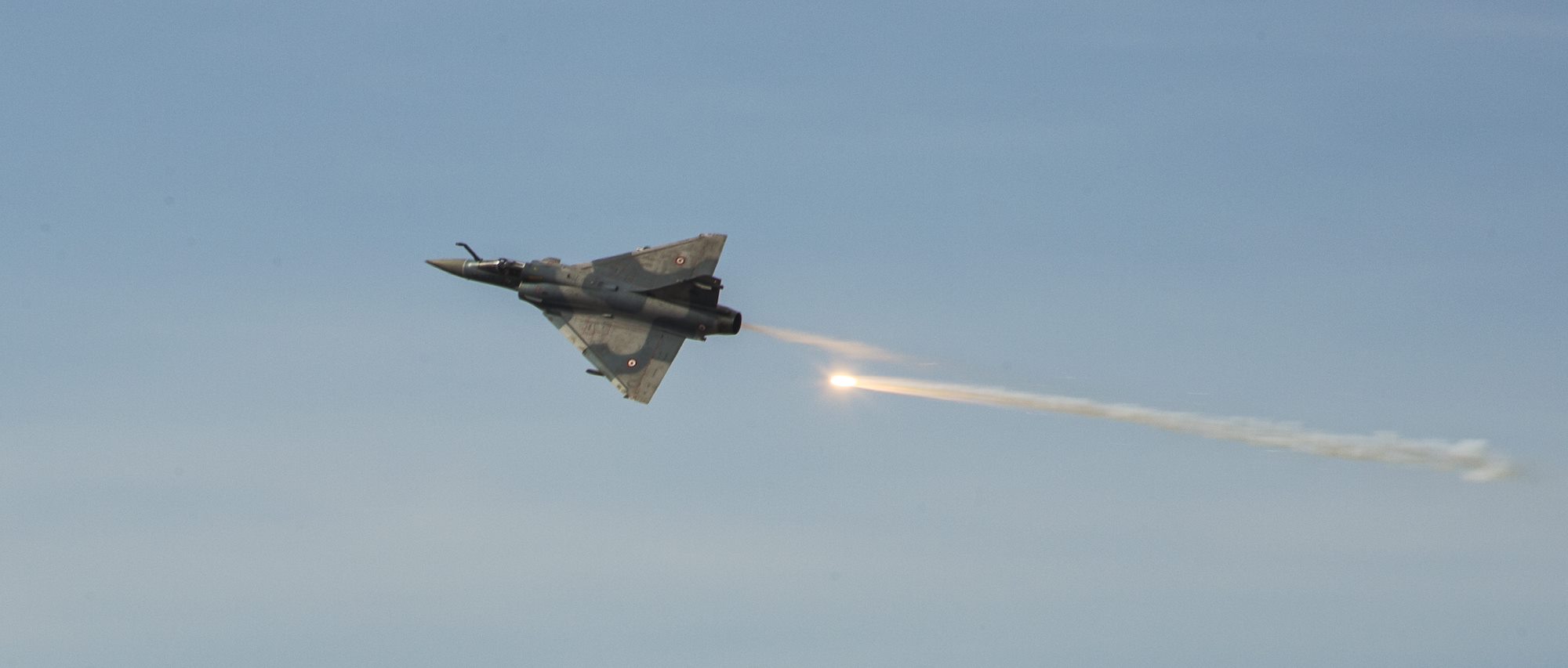 A French Mirage fighter aircraft drops flares as it performs a high-speed pass during the French live fire demonstration near Arta Plage, Djibouti, Jan. 14, 2017. The Mirage and other fighter aircraft use flares as a countermeasure against incoming heat-seeking missiles. (U.S. Air National Guard photo by: Staff Sgt. Christian Jadot)