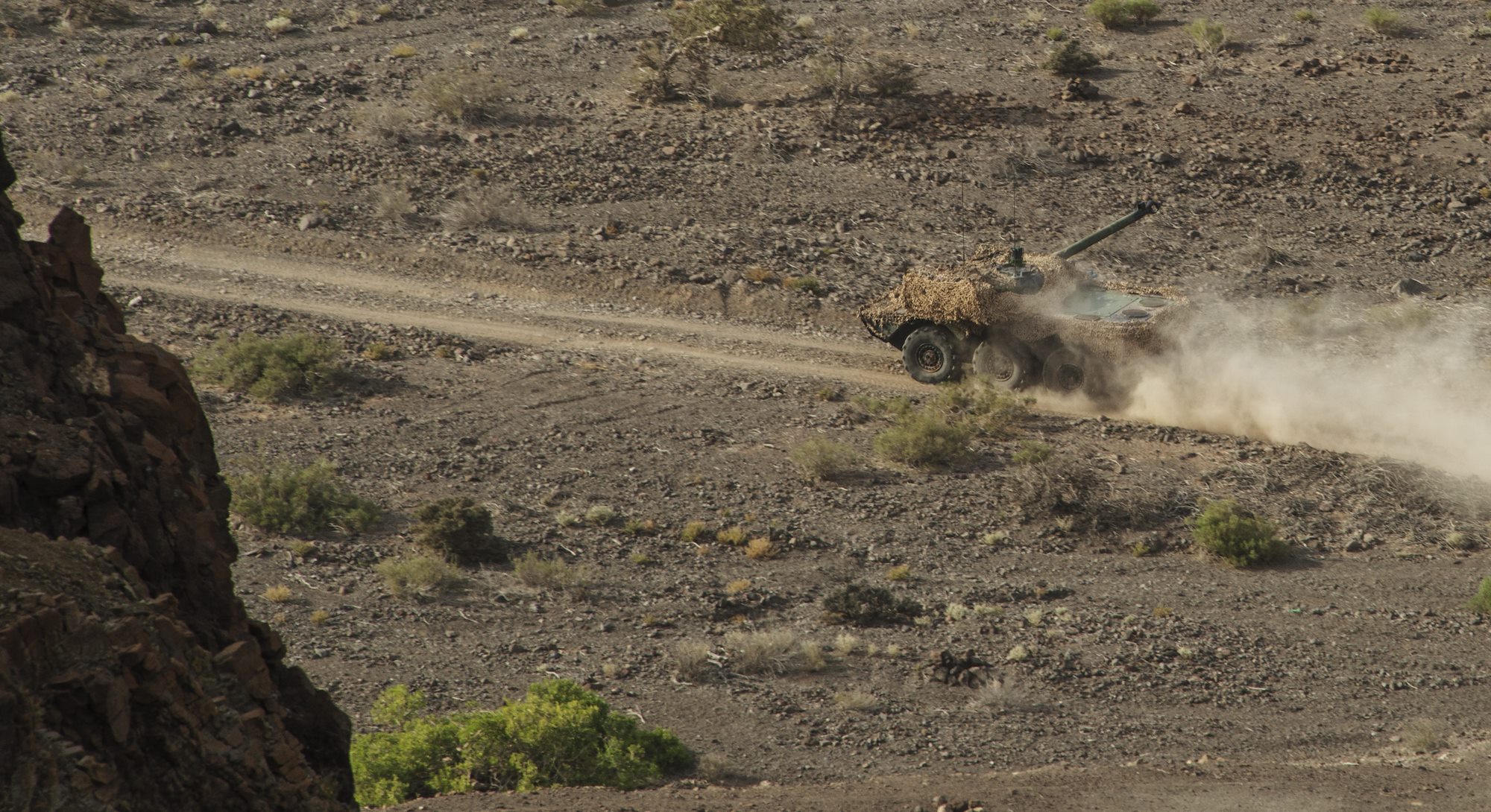 A French AMX-10RCR wheeled armored reconnaissance vehicle keeps its barrel locked in on a simulated target while traversing the terrain during the French live fire demonstration near Arta Plage, Djibouti, Jan. 14, 2017. The AMX-10RCR was developed for light reconnaissance and troop fire support and is capable of engaging other armored vehicles. (U.S. Air National Guard photo by: Staff Sgt. Christian Jadot)