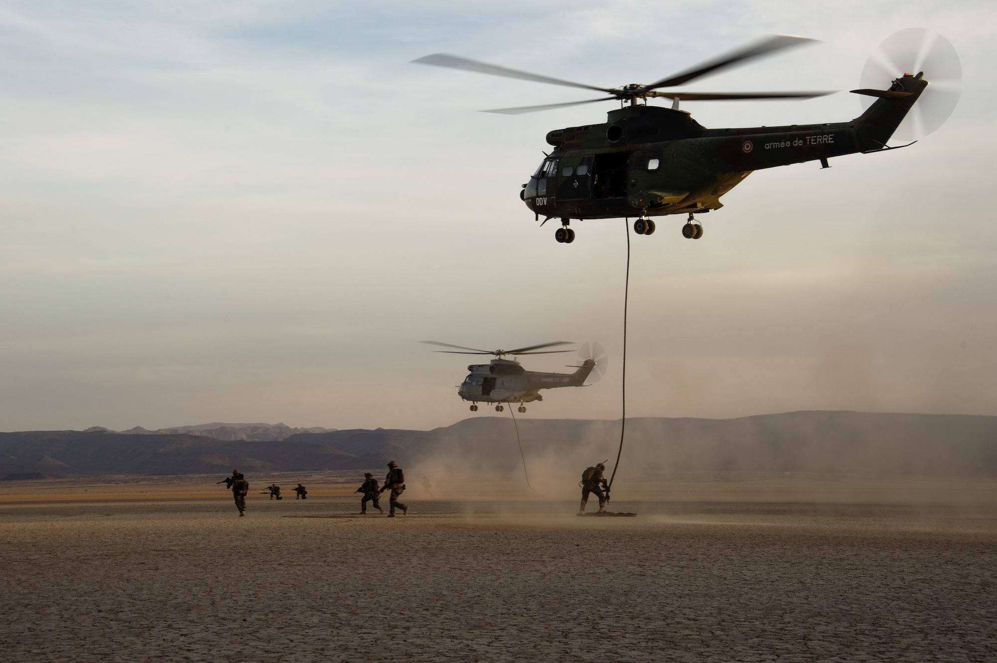 French military members repel out of two SA 330 Puma transport helicopters to secure a landing site during the French live fire demonstration near Grand Bara, Djibouti, Jan. 14, 2017. The SA 330 Puma is a medium lift, all-weather helicopter capable of transporting up to 16 people in and out of a battlefield. (U.S. Air National Guard photo by: Staff Sgt. Christian Jadot)