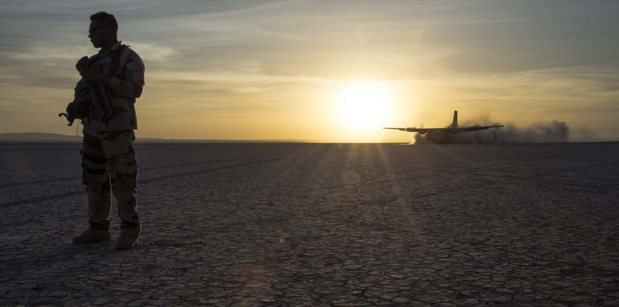 A French military member keeps onlookers at a safe distance from the landing area as a French C-160 Transall transport aircraft touches down on the rough terrain during the French live fire demonstration near Grand Bara, Djibouti, Jan. 14, 2017. The C-160 Transall is a tactical transport aircraft capable of carrying up to 93 troops with the ability to land on an airstrip as short as 400 meters. (U.S. Air National Guard photo by: Staff Sgt. Christian Jadot)