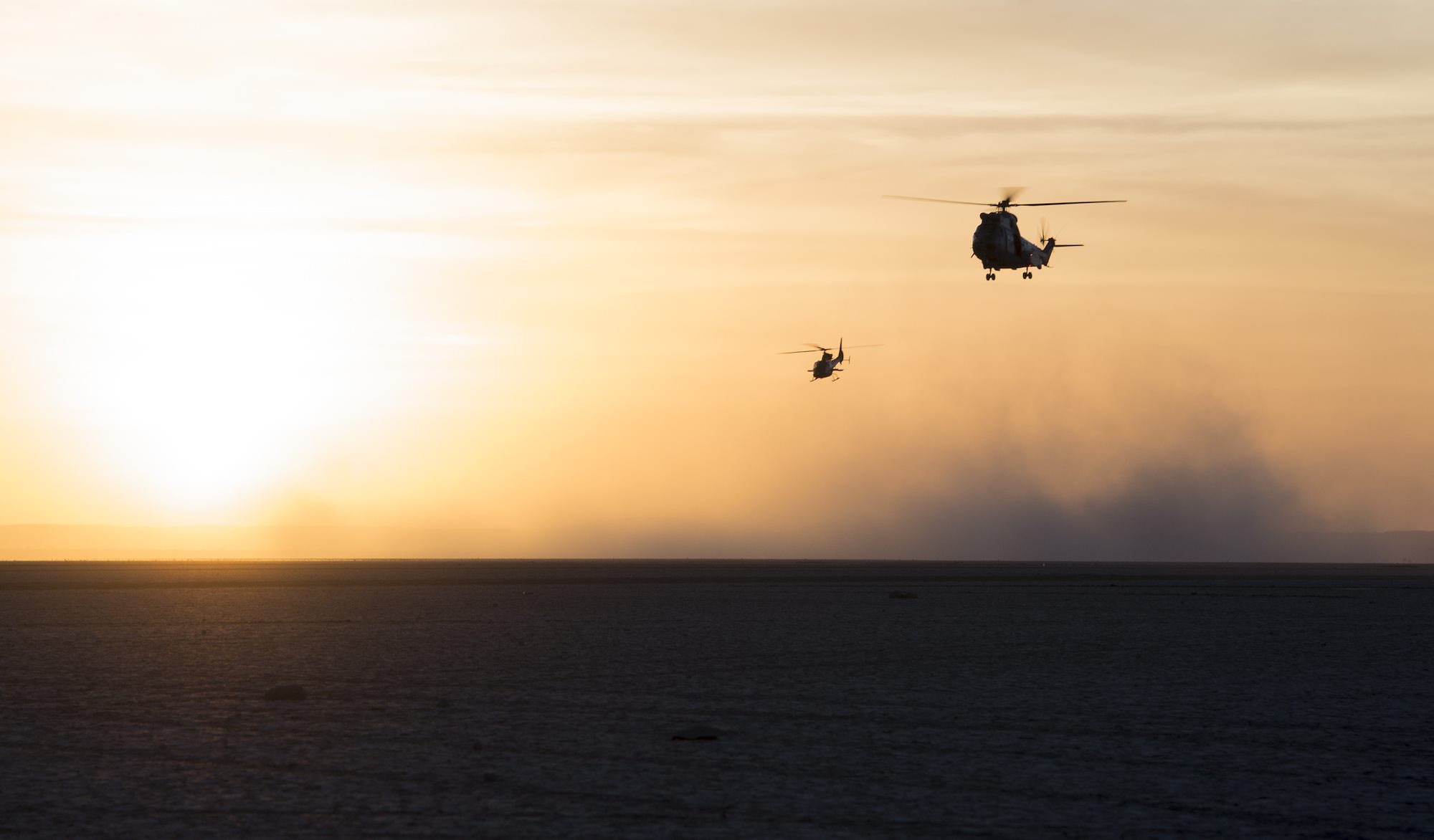 A French SA 330 Puma transport helicopter escorted by an SA 342 Gazelle utility helicopter approach a designed landing site to make a low aerial pass during the French live fire demonstration near Grand Bara, Djibouti, Jan. 14, 2017. The SA 330 Puma is a medium lift all-weather helicopter capable of transporting up to 16 people in and out of a battlefield. The SA 342 Gazelle is a light, five-seat helicopter often used by various militaries for reconnaissance and light attack duties. (U.S. Air National Guard photo by: Staff Sgt. Christian Jadot)