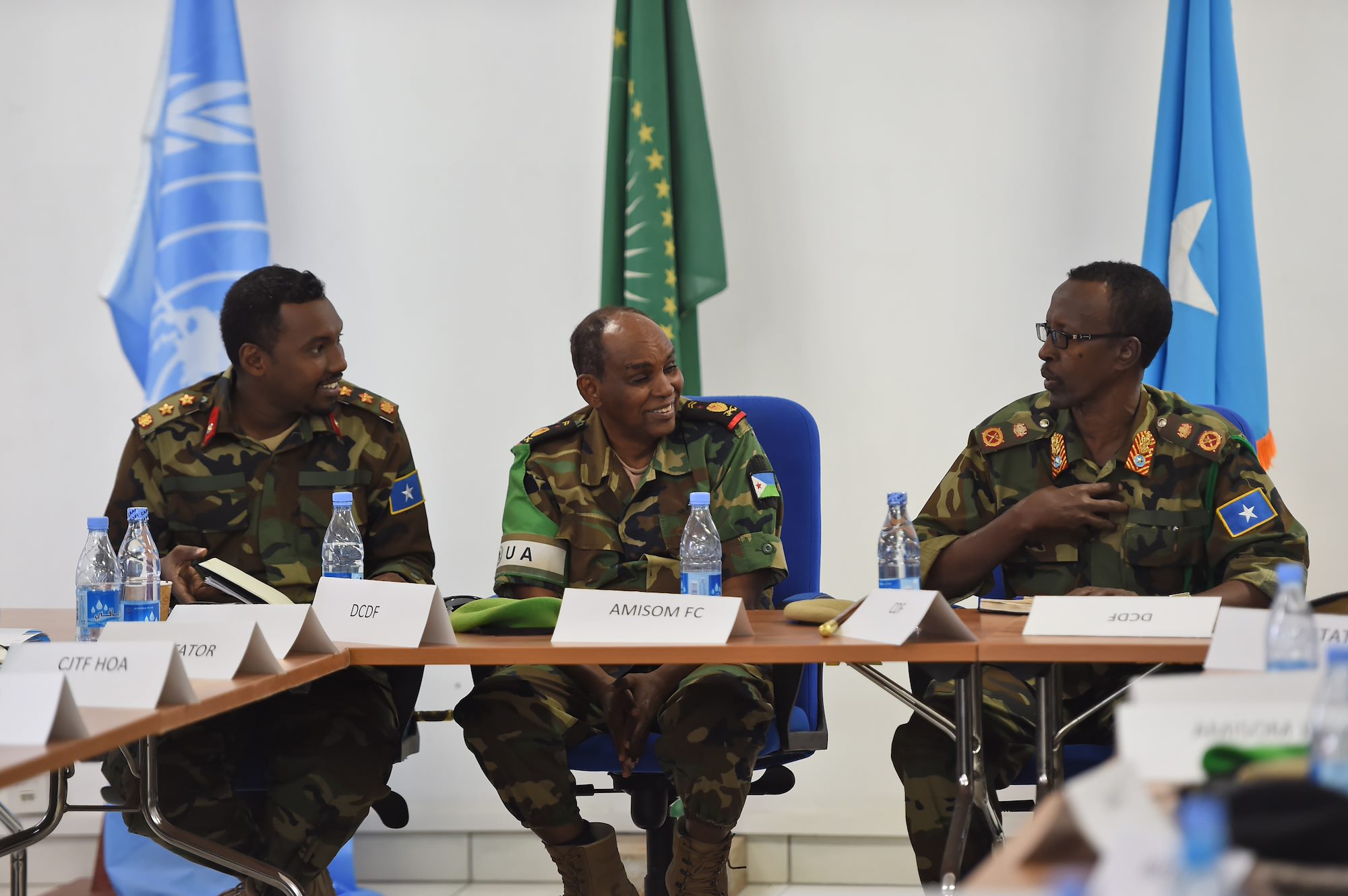 Somali National Army Chief of Defense Forces Maj. Gen. Mohammed Adan Ahmed, right, and Chief of Staff Col. Ahmed Mohammed, left, converse with African Union Mission in Somalia Force Commander Lt. Gen. Osman Noor Soubagleh during the SNA Symposium in downtown Mogadishu, Jan. 12, 2017. The symposium is part of an ongoing international effort to aid security conditions throughout Somalia by fostering the growth and revitalization of the national military defense force, which disbanded following the collapse of the country’s central government in 1991.