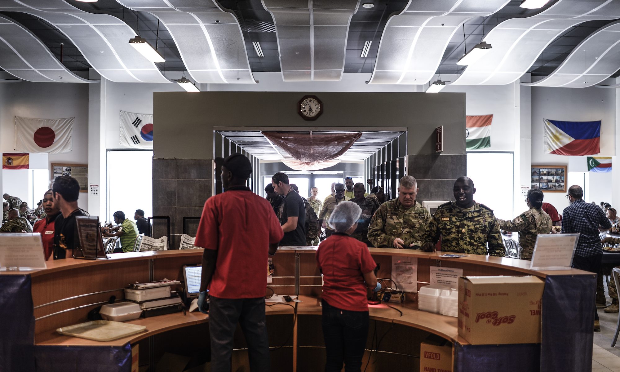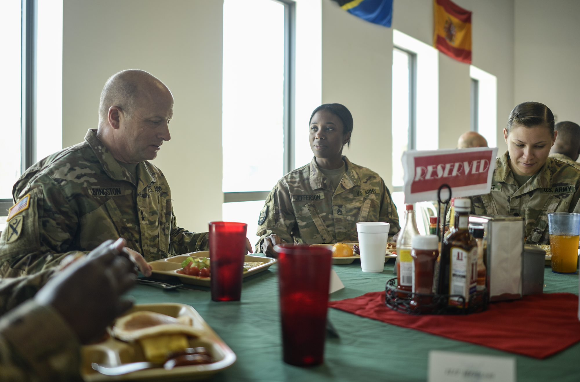 Brig. Gen. Kenneth H. Moore, U.S. Army Africa deputy commander checks into the galley to dine with Army Reserve members during his visit to Camp Lemonnier, Djibouti, Jan. 16, 2017. Brig. Gen. Moore met with Army Reservists to discuss the Army’s overall mission objective on the continent of Africa.