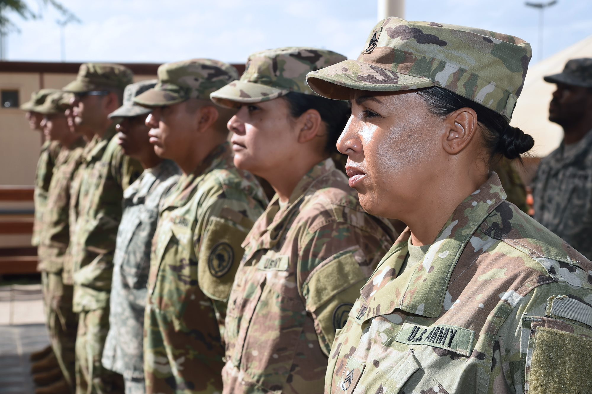 U.S. service members selected for exceptional mission support prepare to be recognized by Vice Chief of Staff of the Army Gen. Daniel B. Allyn at Camp Lemonnier, Djibouti, Jan. 16, 2017. Allyn's visit to Camp Lemonnier included meeting with leadership to discuss on-going operations and challenges in the region, engaging with enlisted Soldiers and junior Army officers over lunch and dinner, and recognizing numerous deployed service members for their outstanding mission contributions. (U.S. Air National Guard photo by Master Sgt. Paul Gorman)