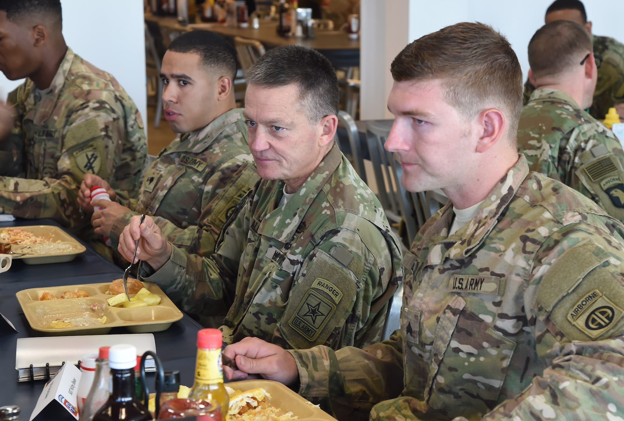 Vice Chief of Staff of the Army Gen. Daniel B. Allyn dines with deployed junior enlisted Soldiers at Camp Lemonnier, Djibouti, Jan. 16, 2017. Allyn's visit included the opportunity to meet with leadership to discuss on-going operations and challenges in the region, as well as recognize numerous service members for outstanding performance in support of Camp Lemonnier, and Combined Joint Task Force-Horn of Africa. (U.S. Air National Guard photo by Master Sgt. Paul Gorman)