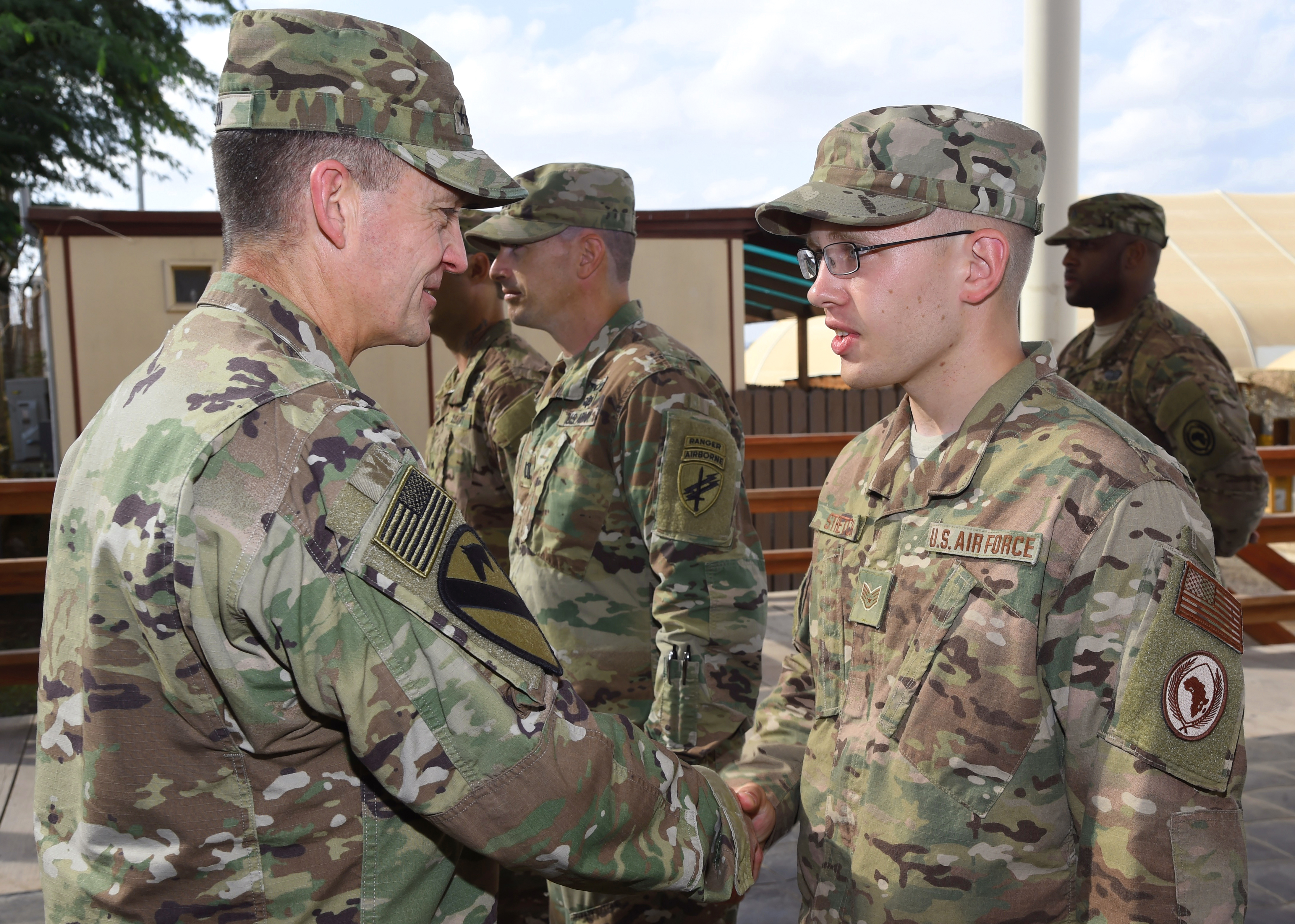 Vice Chief of Staff of the Army Gen. Daniel B. Allyn recognizes Air Force Staff Sgt. Alasdair Stretch for outstanding performance as a financial administration noncommissioned officer at Camp Lemonnier, Djibouti, Jan. 16, 2017. Allyn's visit included the opportunity to meet with leadership to discuss on-going operations and challenges in the region, as well as recognize numerous deployed service members for outstanding performance in support of Camp Lemonnier, and Combined Joint Task Force-Horn of Africa. (U.S. Air National Guard photo by Master Sgt. Paul Gorman)