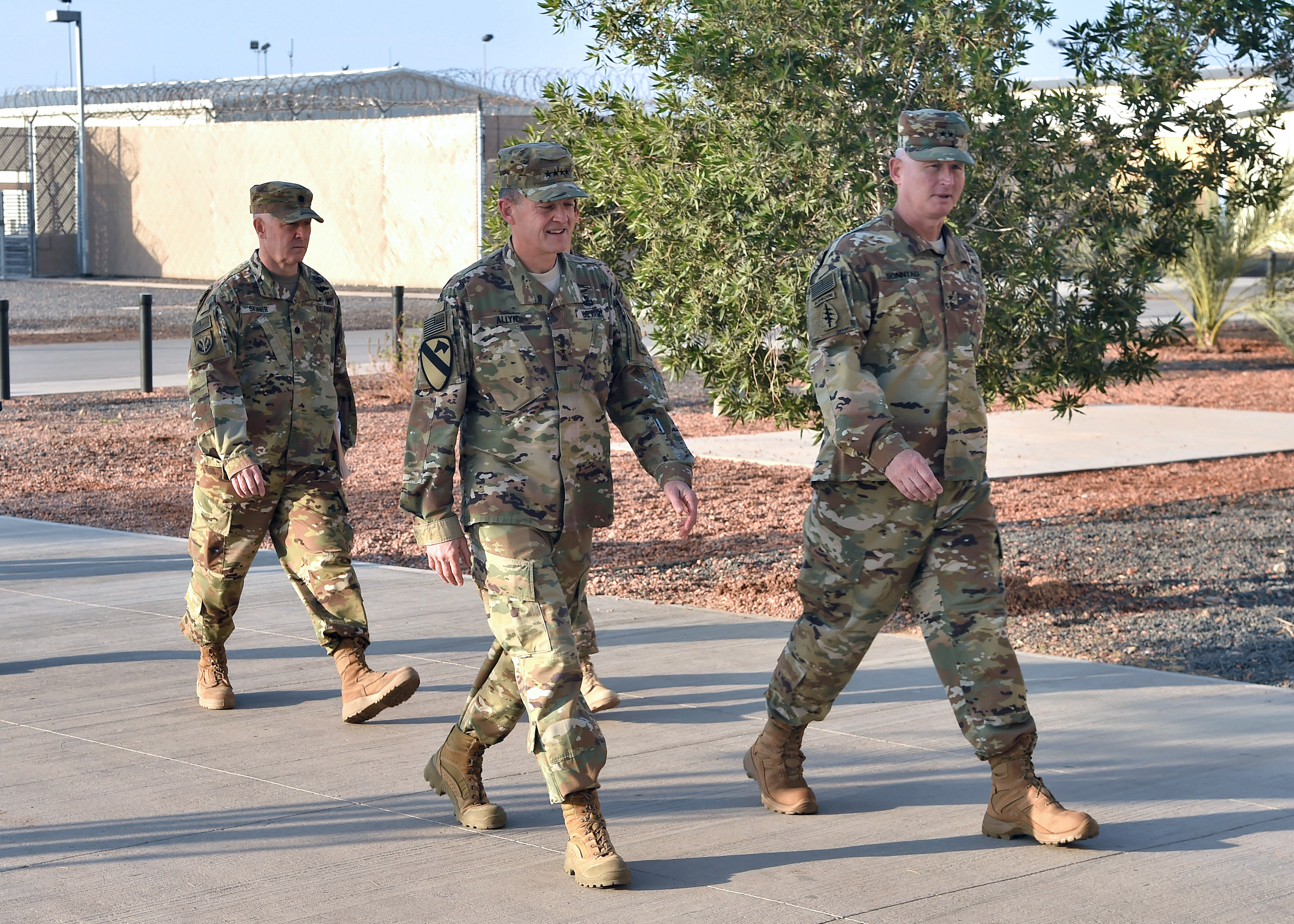 Maj. Gen. Kurt Sonntag, commanding general of Combined Joint Task Force-Horn of Africa, right, accompanies Vice Chief of Staff of the Army Gen. Daniel Allyn during his visit to Camp Lemonnier, Djibouti, Jan. 16, 2017. Allyn took the opportunity to meet with leadership to discuss on-going operations and challenges in the region, meet with enlisted Soldiers and junior Army officers over lunch and dinner, and recognize numerous deployed service members for outstanding mission contributions. (U.S. Air National Guard photo by Master Sgt. Paul Gorman)