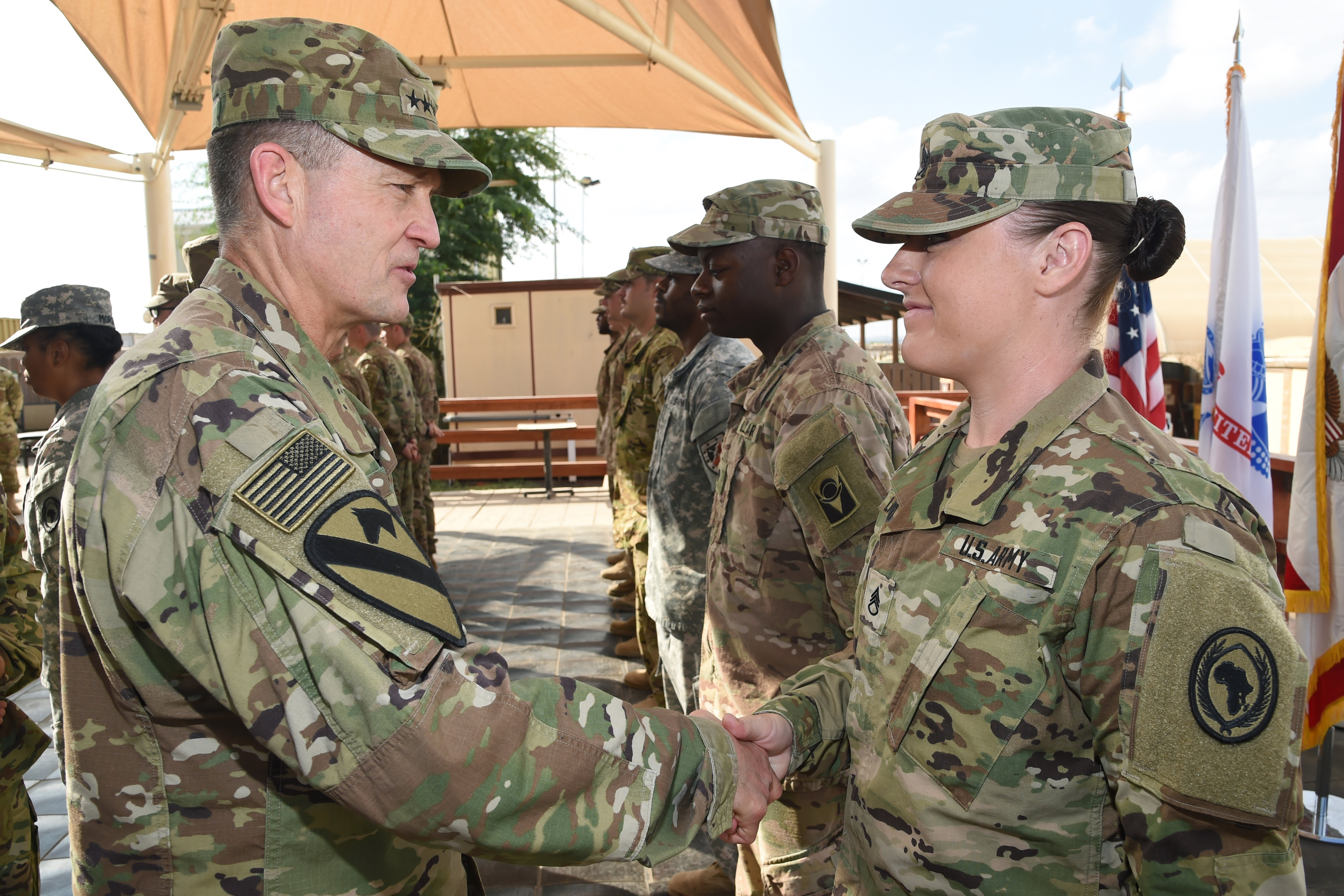Vice Chief of Staff of the Army Gen. Daniel B. Allyn recognizes Army Staff Sgt. Kendra Langsford for outstanding performance as an intelligence noncommissioned officer at Camp Lemonnier, Djibouti, Jan. 16, 2017. Allen's visit included the opportunity to meet with leadership to discuss on-going operations and challenges in the region, as well as recognize numerous deployed service members for outstanding performance in support of Camp Lemonnier, and Combined Joint Task Force-Horn of Africa. (U.S. Air National Guard photo by Master Sgt. Paul Gorman)
