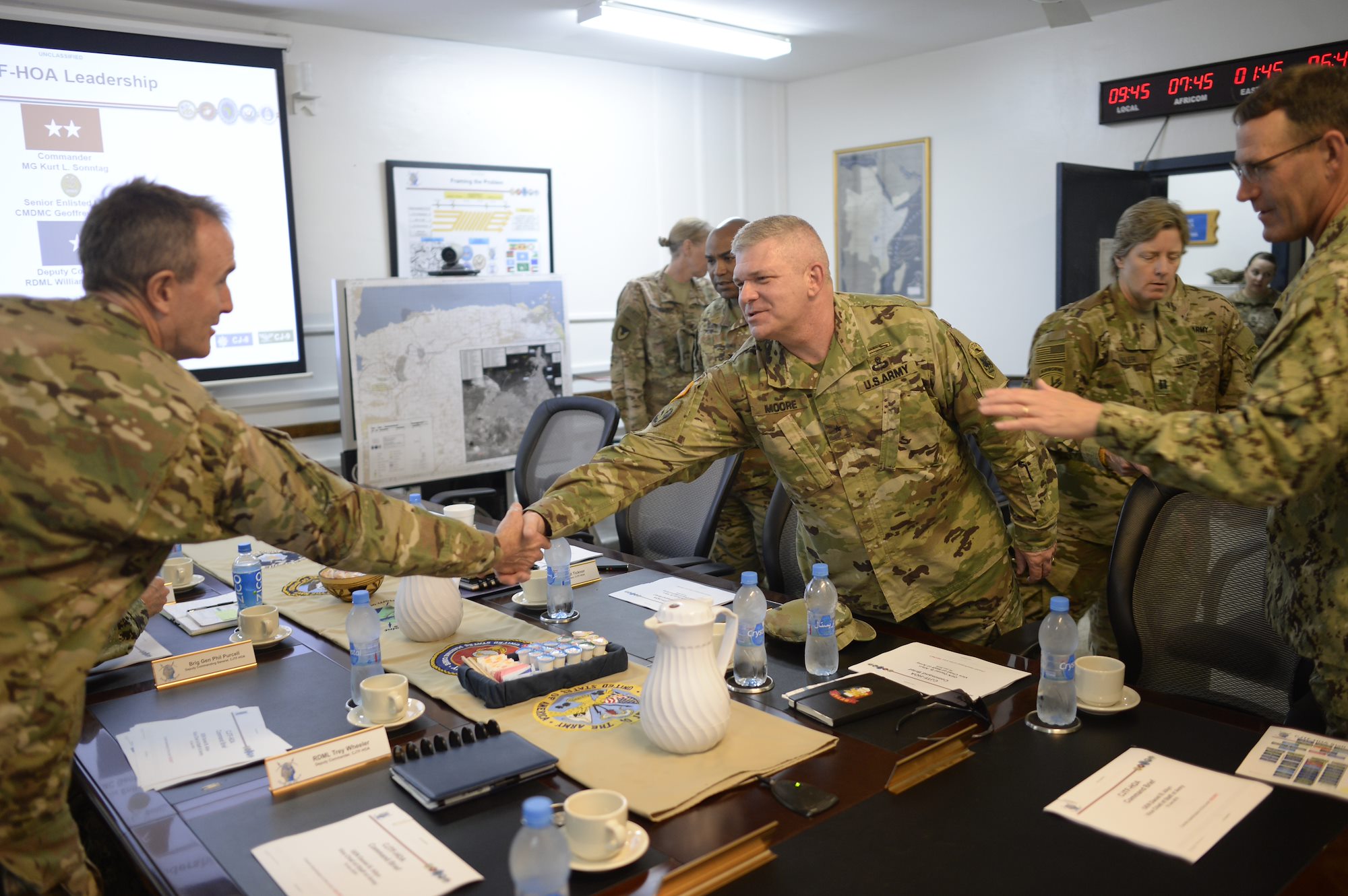 U.S. Navy Rear Adm. William Wheeler III, outgoing Combined Joint Task Force-Horn of Africa deputy commander, introduces Brig. Gen. Kenneth H. Moore, U.S. Army Africa deputy commander, to Air Force Brig. Gen. Howard P. Purcell, incoming CJTF-HOA deputy commanding general during an office call at Camp Lemonnier, Djibouti, Jan. 16, 2017. Brig. Gen. Moore met with the CJTF-HOA senior leaders to discuss capabilities of the Army, and how the Army Reserve can better support future mission of CJTF-HOA.