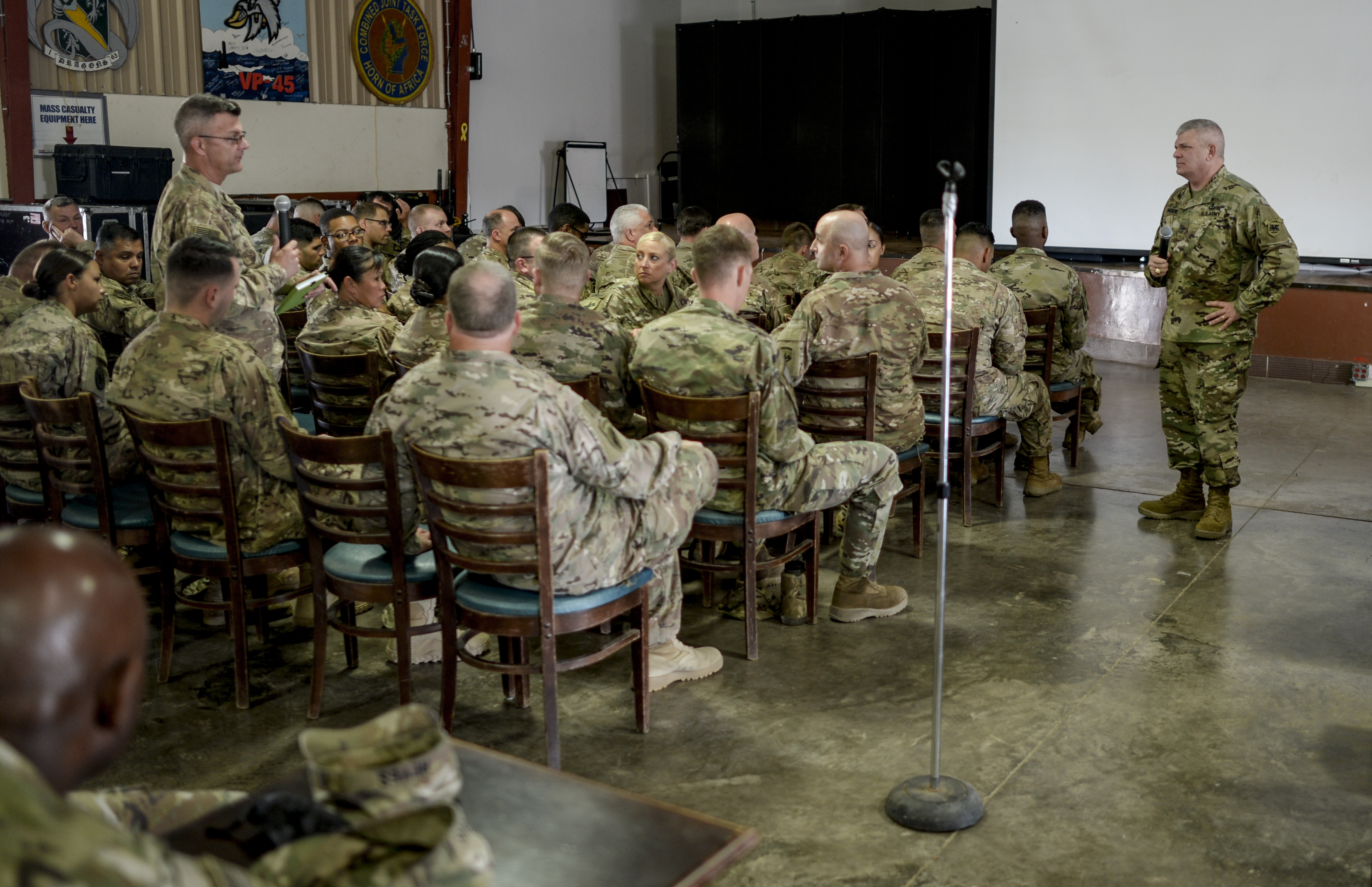 U.S. Army Brig. Gen. Kenneth H. Moore, U.S. Army Africa deputy commander, takes a question at a “town hall” style meeting during his visit to Camp Lemonnier, Djibouti, Jan. 16, 2017. Brig. Gen. Moore met with Army Reservists to present an overview of the Army’s mission in Africa and drive home the ‘Total Army’ concept.