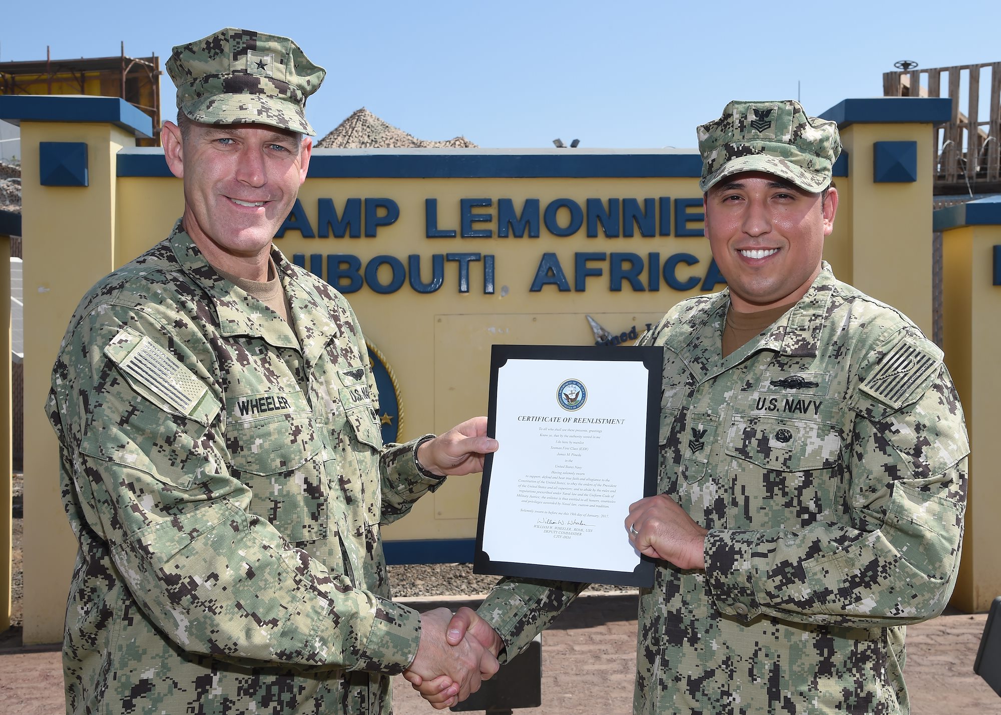 U.S. Navy Rear Adm. William Wheeler administers the oath of enlistment to Petty Officer 1st Class James Pineda, flag writer for Combined Joint Task Force-Horn of Africa, at Camp Lemonnier, Djibouti, Jan. 19, 2017. Pineda's desire to re-enlist while serving in a deployed environment exemplifies the sense of commitment demonstrated each year, by the thousands of Soldiers, Sailors, Airmen and Marines who elect to turn their military service into a long-term career. (U.S. Air National Guard photo by Master Sgt. Paul Gorman)