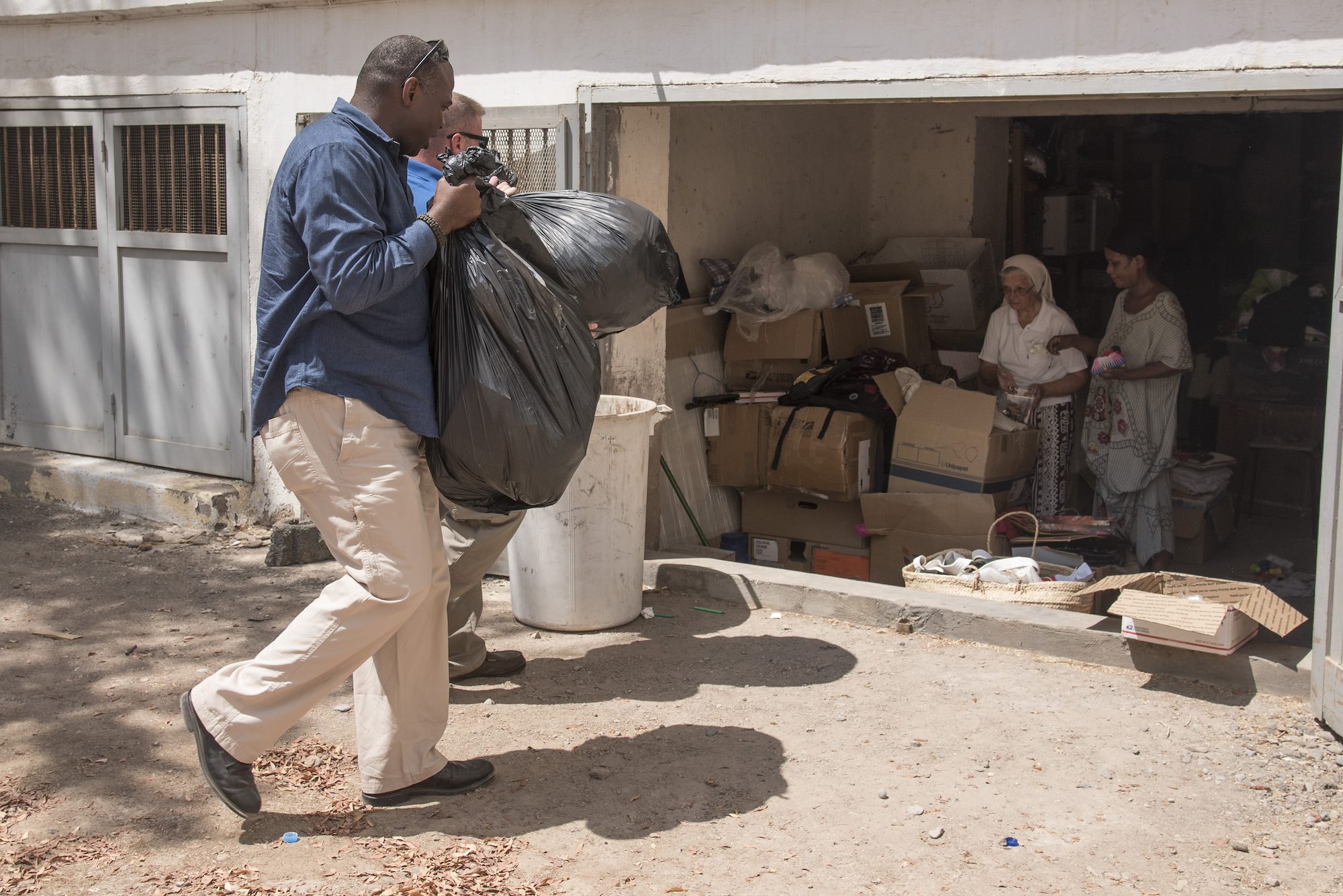 DJIBOUTI, DJIBOUTI- U.S. Service members of Combined Joint Task Force-Horn of Africa Religious Affairs Office give donated clothes and items to the Cathedral of Our Lady of the Good Shepherd during their visit with Bishop Giorgio Bertin, Oct. 27, 2016, in Djibouti. The team met with Bishop Bertin to discuss future humanitarian projects and where future donated items are most needed. (U.S. Air Force photo by Staff Sgt. Tiffany DeNault)