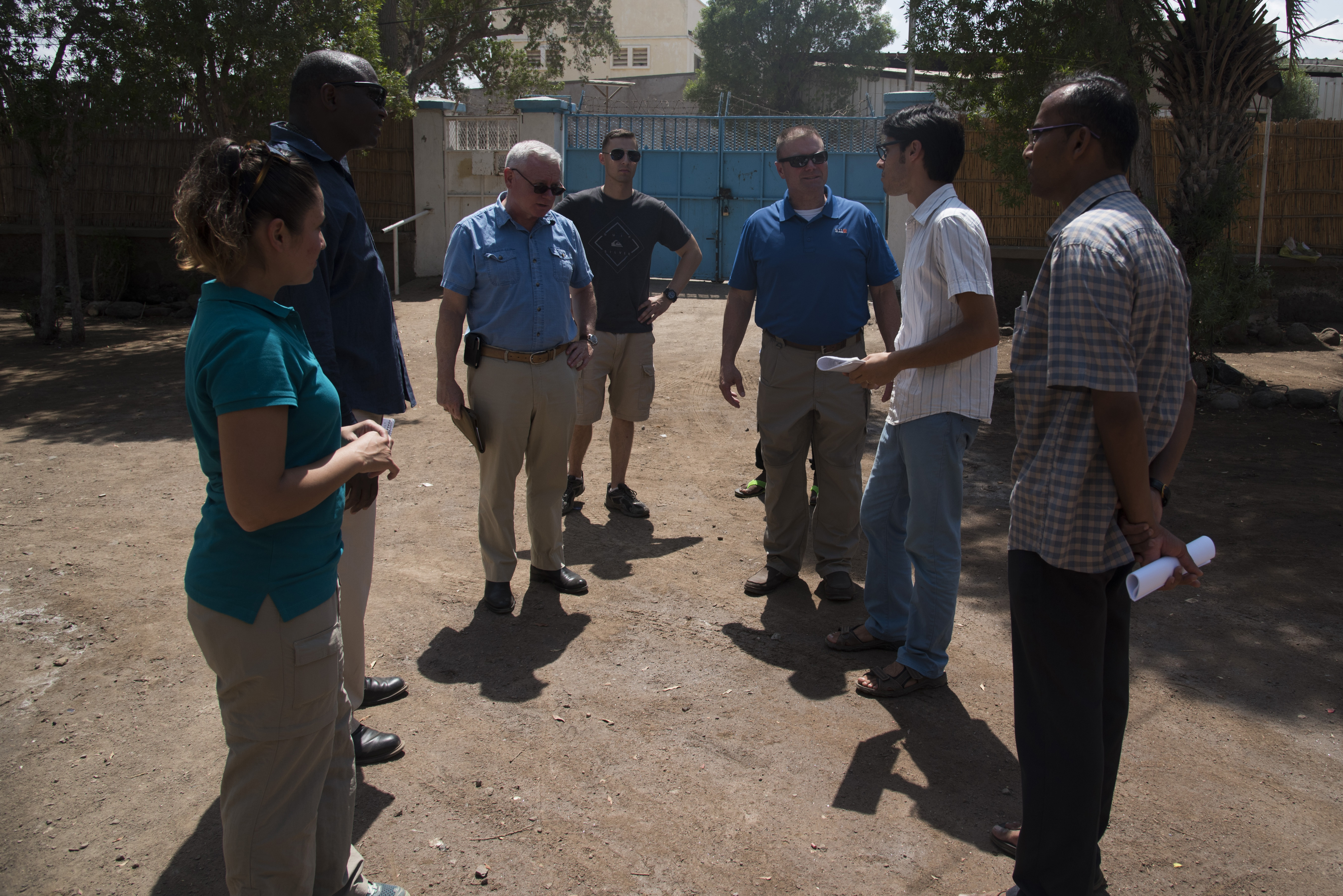 DJIBOUTI, DJIBOUTI- U.S. Service members of Combined Joint Task Force-Horn of Africa Religious Affairs Office meet with program leads at Caritas, a children’s refuge, to determine where future donated items will be of better use, Oct. 27, 2016, in Djibouti. The team initially met with Bishop Giorgio Bertin, Cathedral of Our Lady of the Good Shepherd, to drop off donations and to discuss future humanitarian projects before visiting Horn of Africa English School students and Caritas. (U.S. Air Force photo by Staff Sgt. Tiffany DeNault)