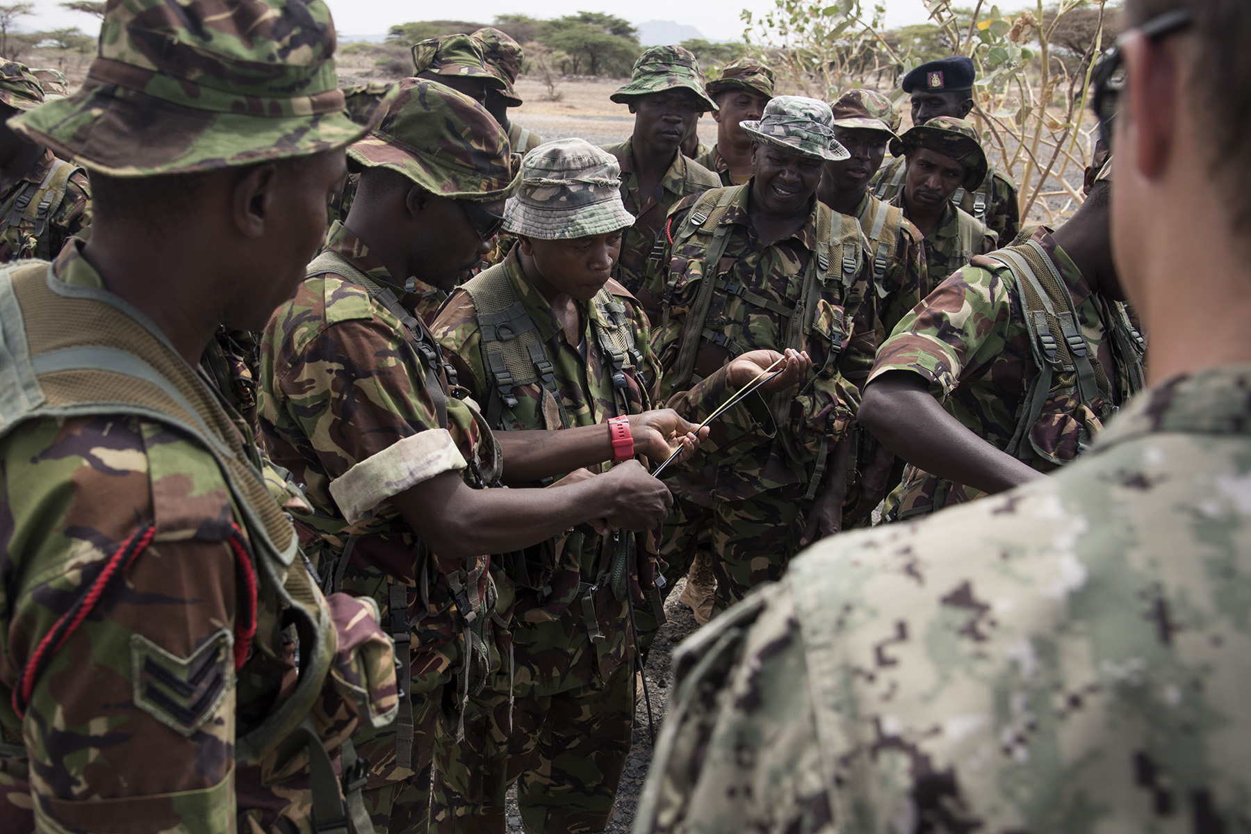 KENYA- U.S. Navy Sailors with Task Force Sparta teach Kenya Defense Forces combat engineers how set up their own non-electric demolition charges during Deliberate Kindle 2016, Sept. 19, at a training center in Kenya. Deliberate Kindle 2016 is taught by U.S. Navy explosive ordnance disposal technicians and a dive independent duty corpsman assigned to Combined Joint Task Force-Horn of Africa. It is a four-week counter-improvised explosive device course designed to provide training in countering improvised explosive devices and unexploded ordnance, medical, and train-the-trainer skills to approximately 53 KDF soldiers in preparation for future deployments with the African Union Mission in Somalia. (U.S. Air Force photo by Staff Sgt. Tiffany DeNault)
