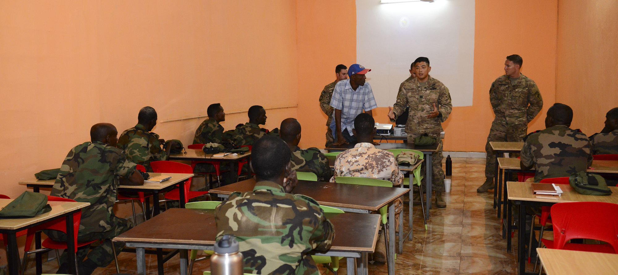 U.S. Army Staff Sgt. Matthew Glaberman, Charlie Company, 411th Civil Affairs Battalion operations sergeant, talks about the effects combat stress can have on a person in a deployed environment, and how to recognize and treat it during a mental health sharing of best practices Oct. 10, 2016, in Mogadishu, Somalia. More than 40 members of the Uganda People’s Defense Force attended the class to learn about combat stress while they are deployed in support of the African Union Mission to Somalia. (U.S. Air Force photo by Staff Sgt. Eric Summers Jr.)