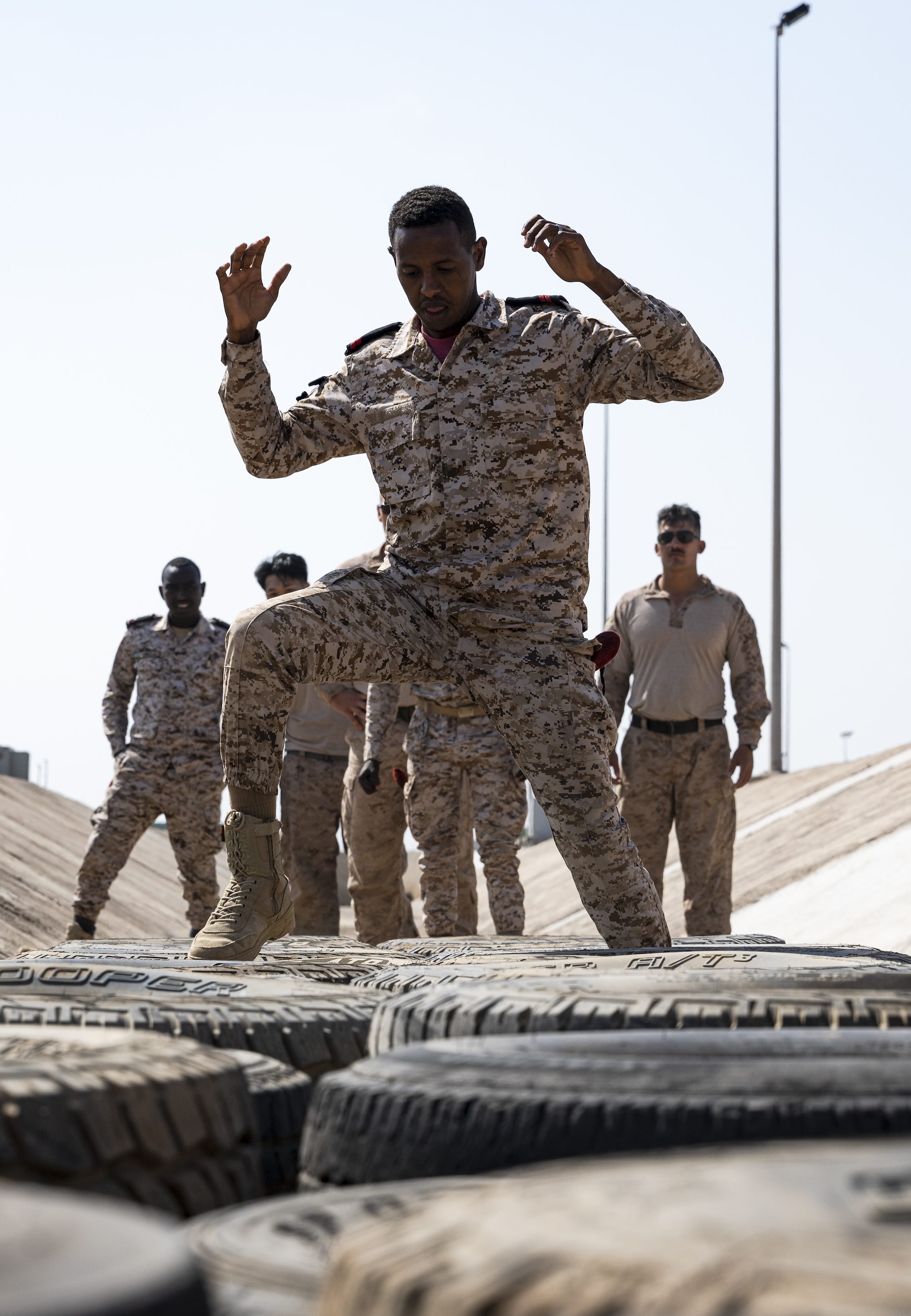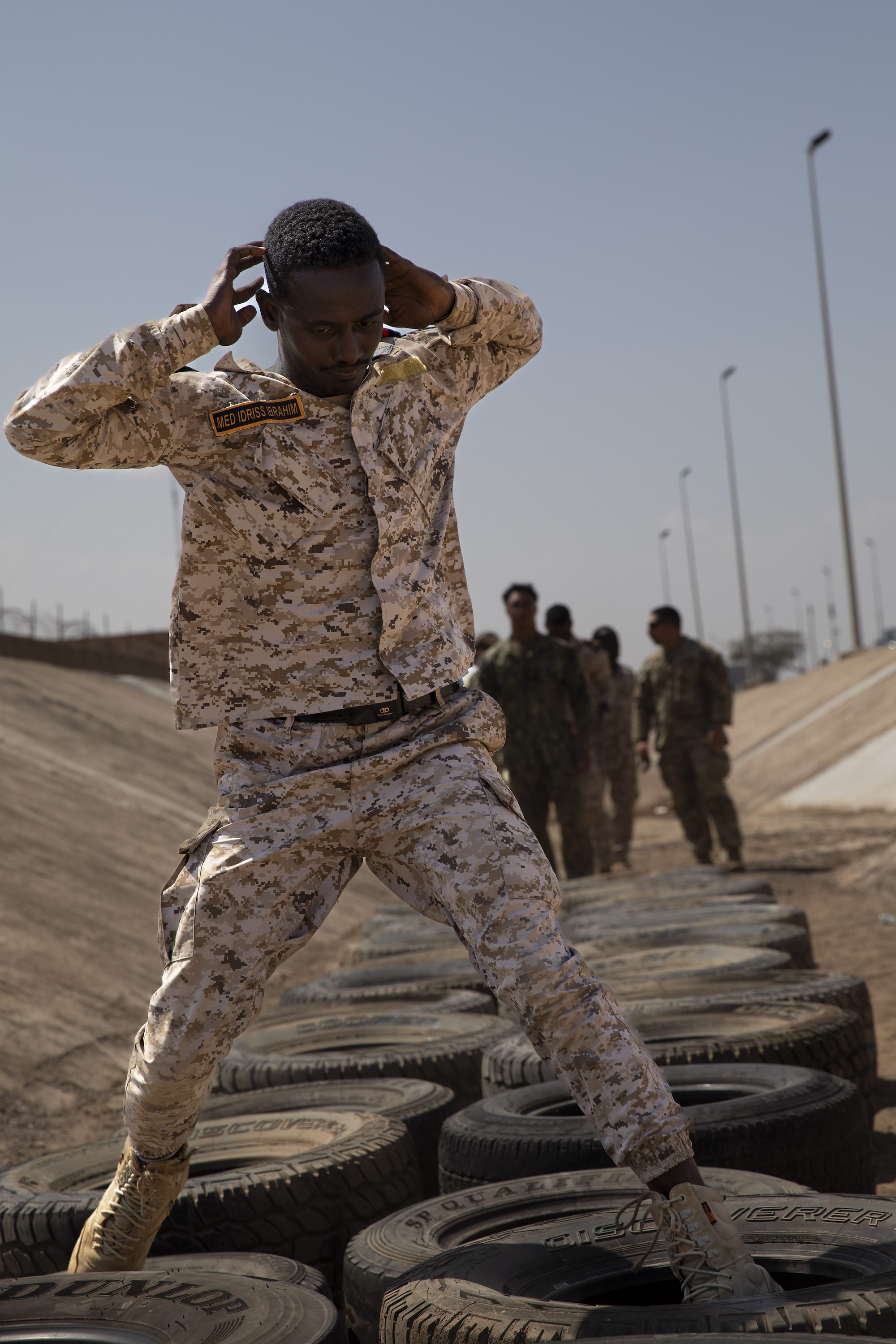 A Djibouti Armed Forces member participates in the tire obstacle course during the Warrior Day competition at Camp Lemonnier, Djibouti, Feb 4, 2025. The obstacle course contained five different sections including high knees, crouch run, hip-high barriers, group wall climb and high crawl. (U.S. Army photo by Spc. Micheala Maldonado)