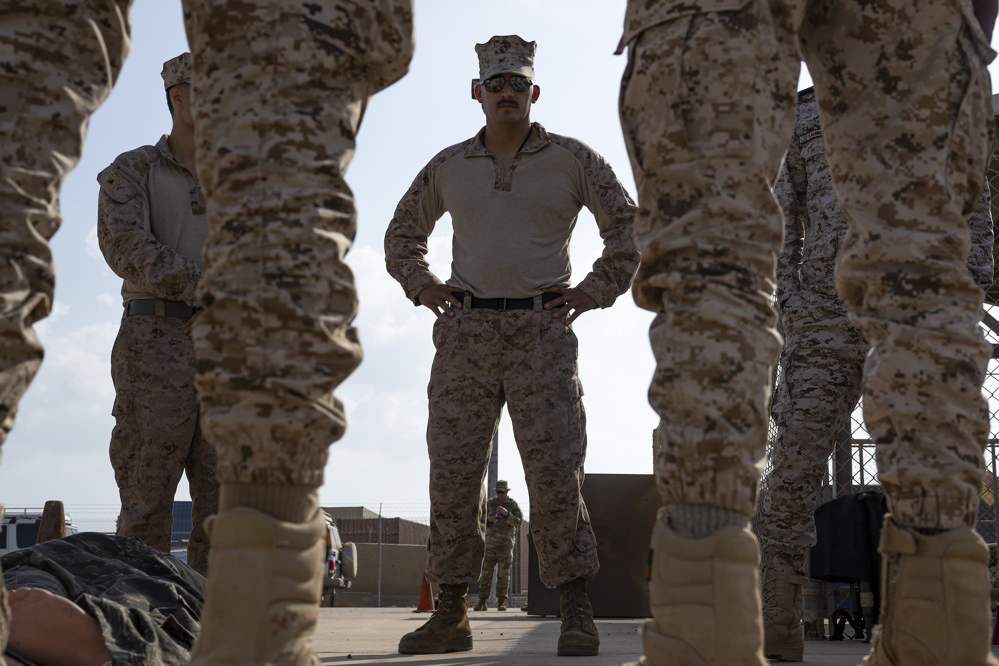 A U.S. Marine listens during a group discussion amongst allies, partners and service members during a Fundamentals of Global Health Engagement course at Camp Lemonnier, Djibouti, Feb. 25, 2025. The three-day course was centered on establishing and improving the awareness level and understanding of U.S. Department of Defense global health engagements with partners and allies. (U.S. Air Force photo by Airman 1st Class Synsere Howard)