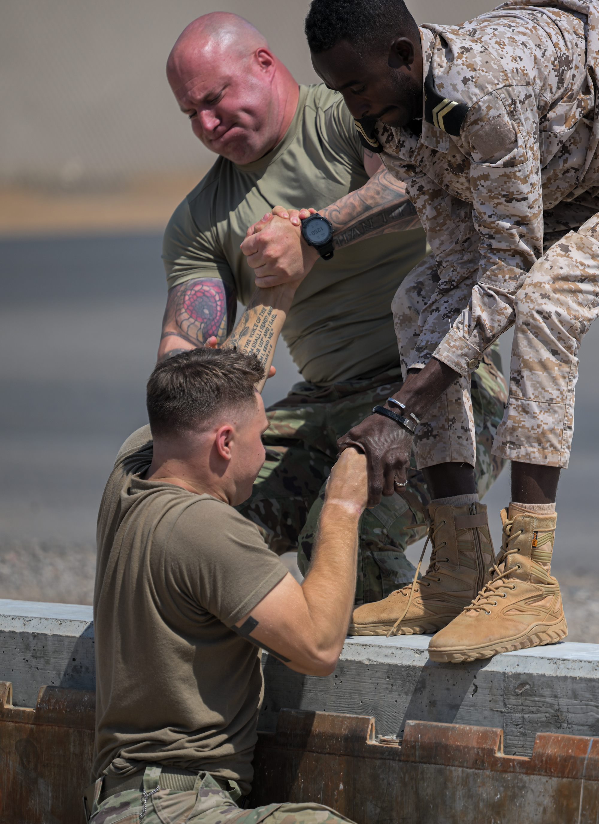 Teams of Djibouti military and Camp Lemmonier, Djibouti service members collaborated in successfully completing the Warrior Day obstacle course at Camp Lemonnier, Djibouti, Feb. 4, 2025. Warrior Day enhanced teamwork, trust and cooperation, ensuring the seamless collaboration between U.S. and Djiboutian forces continues.(U.S. Air Force photo by Airman 1st Class Synsere Howard)
