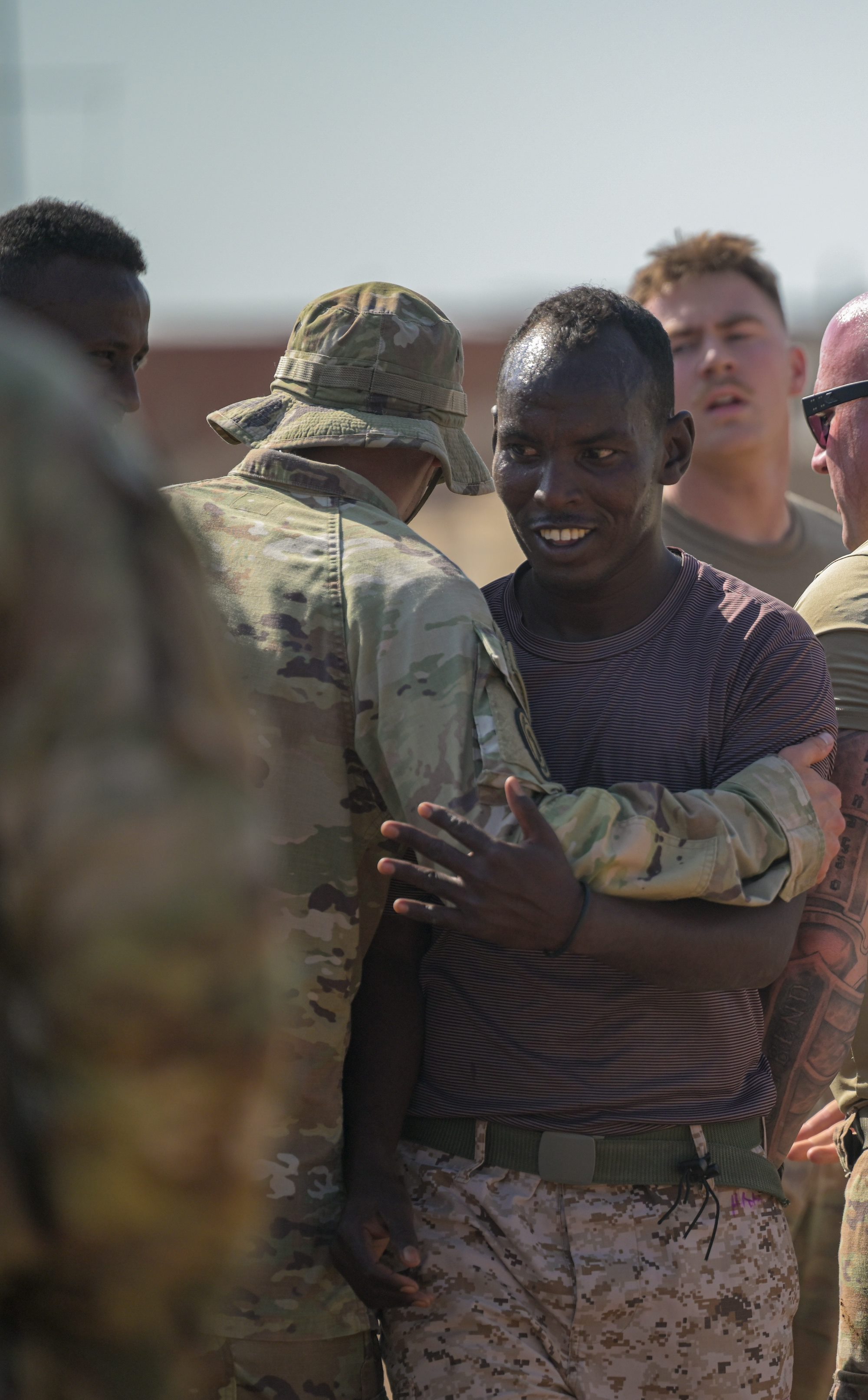 Teams made up of US and Djibouti military service members celebrate their successes as they navigate through different challenges presented during the Warrior Day competition held on Camp Lemonnier, Djibouti, Feb. 4, 2025. Joint events and competitions like Warrior Day reinforce the teamwork and trust essential for mission success with our Djiboutian partners through the development of camaraderie and strengthening of the partnership between CJTF-HOA and FAD through teamwork and shared challenges(U.S. Air Force photo by Airman 1st Class Synsere Howard)