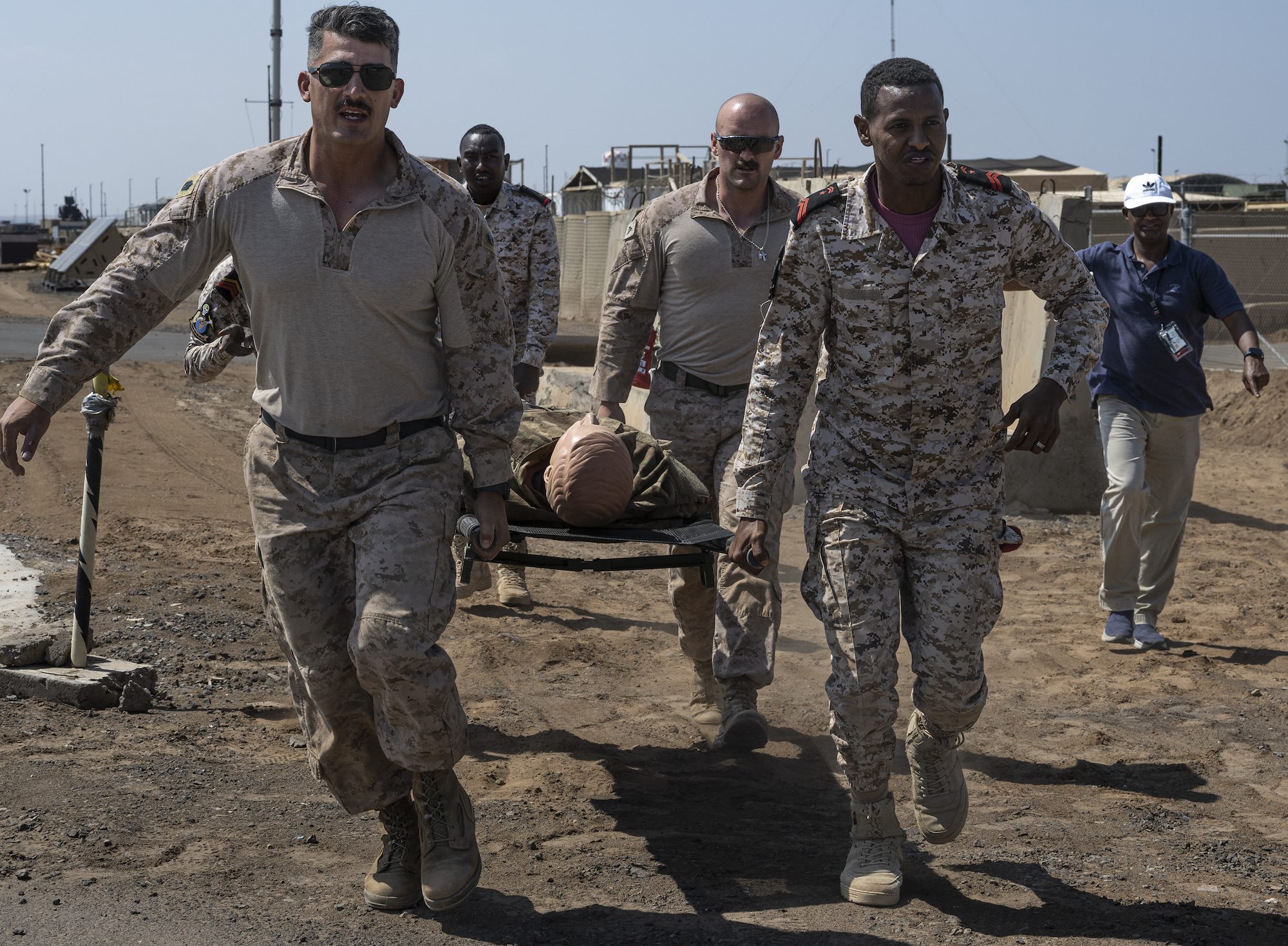 U.S. Marines and Djiboutian Forces Armée Djiboutienne (FAD) service members, assigned to team one, perform a litter carry during Warrior Day at Camp Lemonnier, Djibouti, Feb. 4, 2025. U.S. and FAD service members demonstrated warrior ethos and teamwork during this part of the event. (U.S. Air Force photo by Airman 1st Class Joseph Bartoszek)