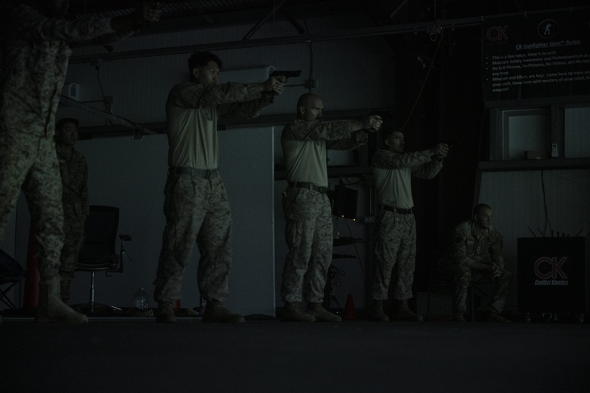 Djiboutian Forces Armée Djiboutienne (FAD) service members and U.S. Marines assigned to Team One, aim during the gunfighter virtual shooting range during Warrior Day at Camp Lemonnier, Djibouti, Feb. 4, 2025. Warrior Day fostered teamwork, trust and interoperability, reinforcing the partnership between U.S. and Djiboutian forces. (U.S. Air Force photo by Airman 1st Class Joseph Bartoszek)