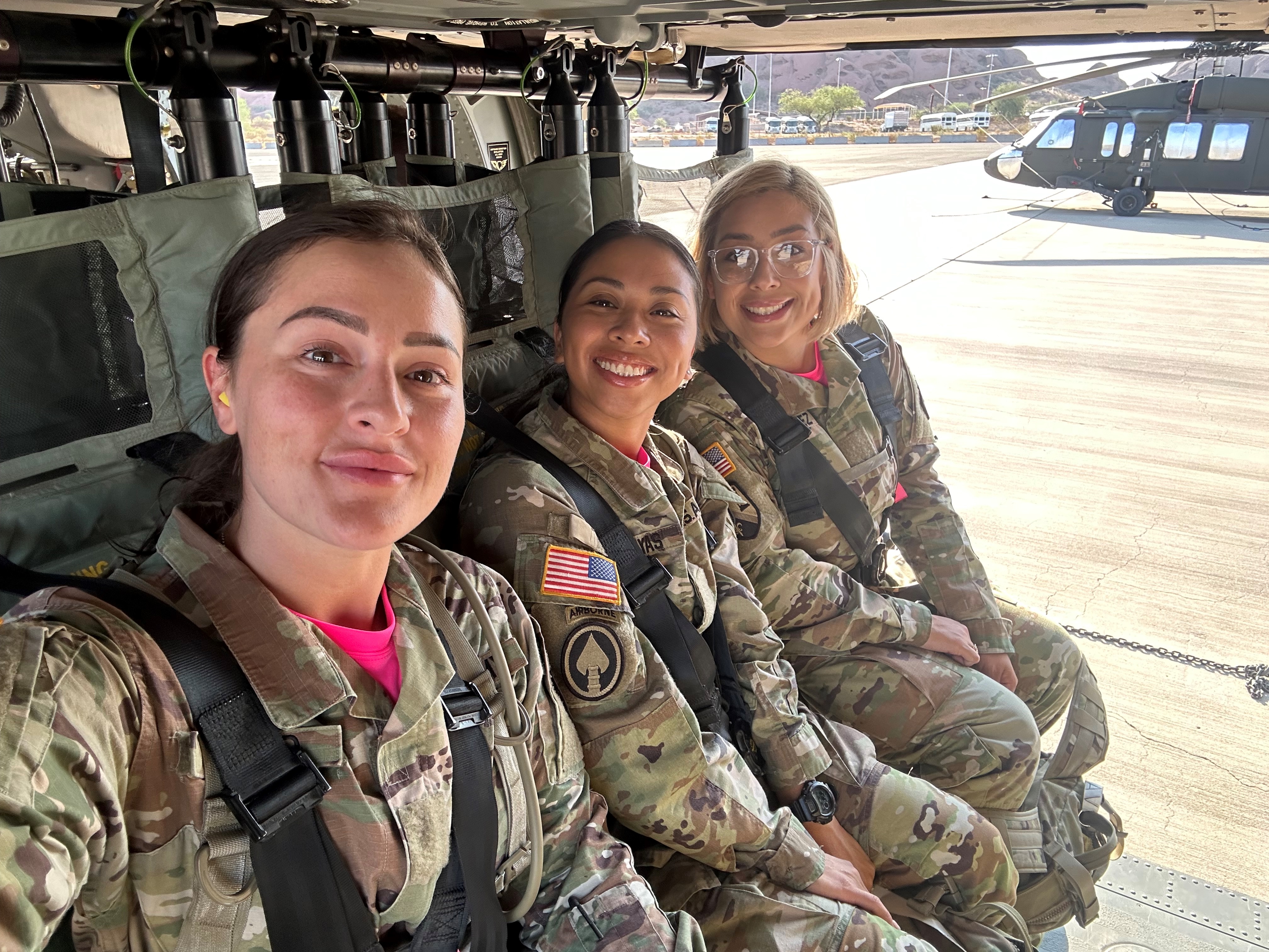 Warrant Officer candidates Chelsey Ewald, Yanie Matyas and Jailene Valdez take a helicopter to Camp Navajo, Flagstaff Arizona, in preparation of their volunteer event. The photo depicts U.S. Army Staff Sgt. Jailene Valdez to highlight her Warrant Officer journey in Combined Joint Task Force-Horn of Africa’s Humans of HOA feature. (Courtesy photo)