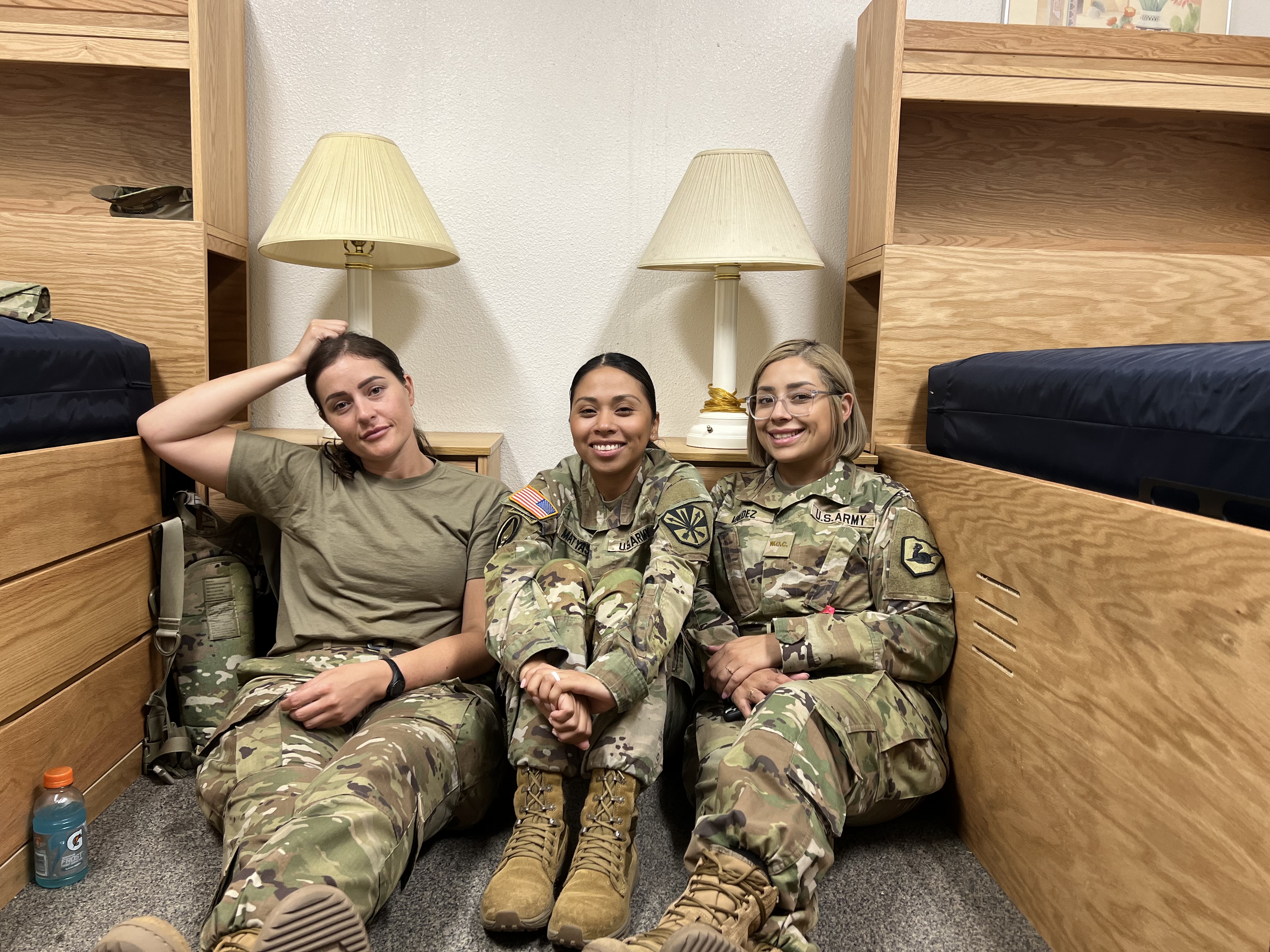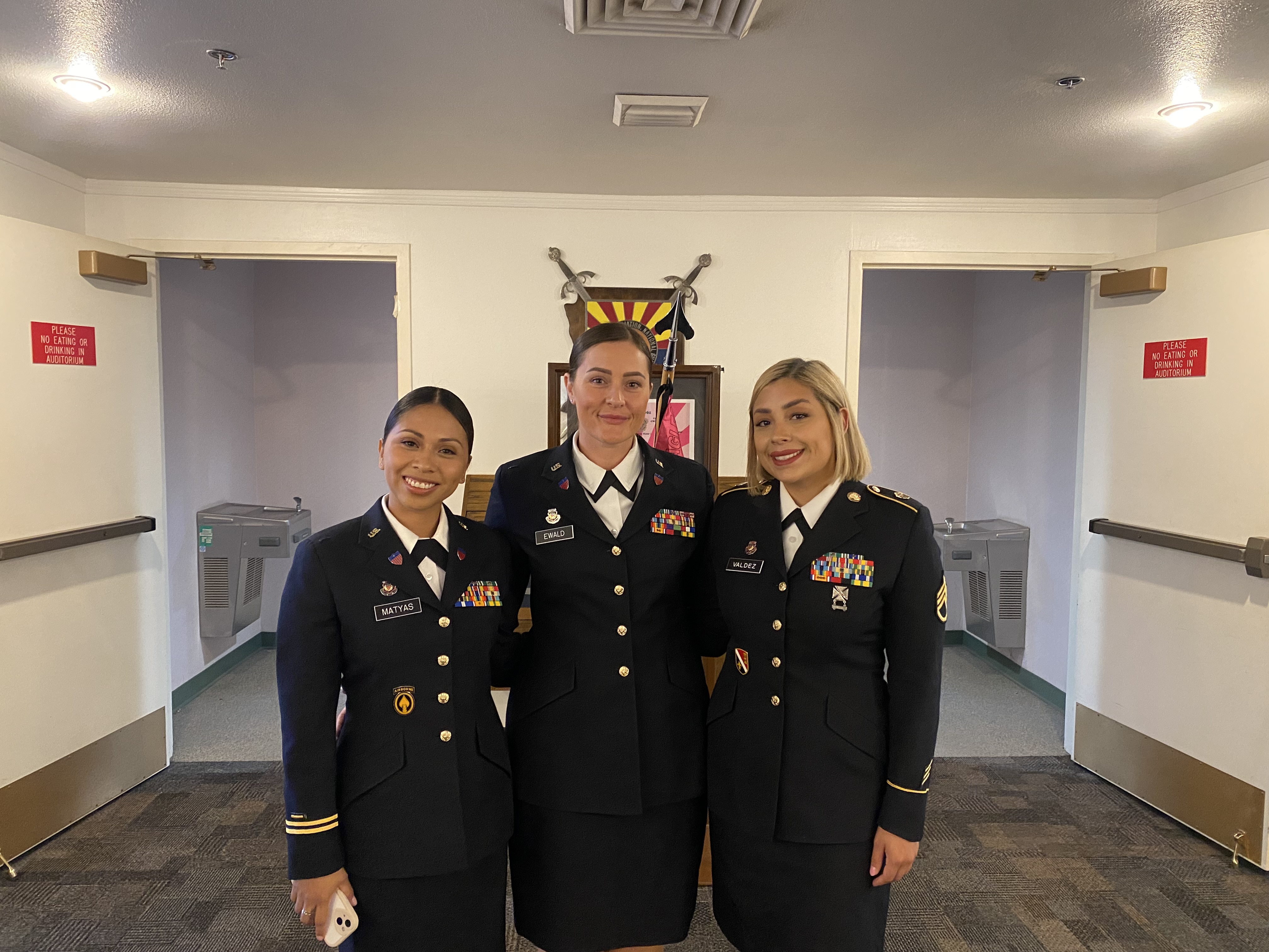 Warrant Officer Yanie Matyas, Warrant Officer Chelsey Ewald and Warrant Officer Jailene Valdez pose before their graduation of their Warrant Officer Candidate course. All three grew close not only because of their shared human resource roles, but also their mindsets and drive to make a difference in the military. The photo