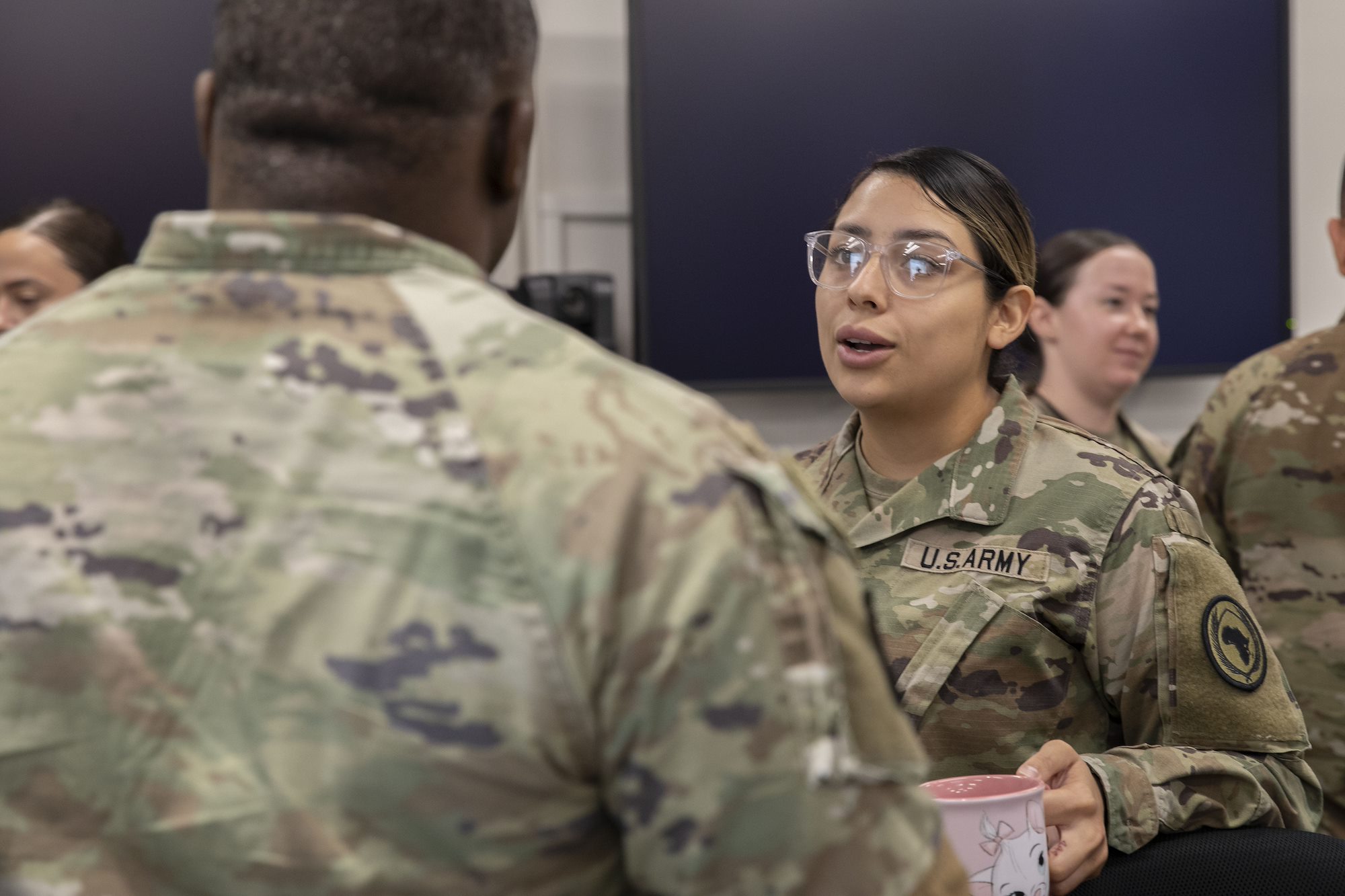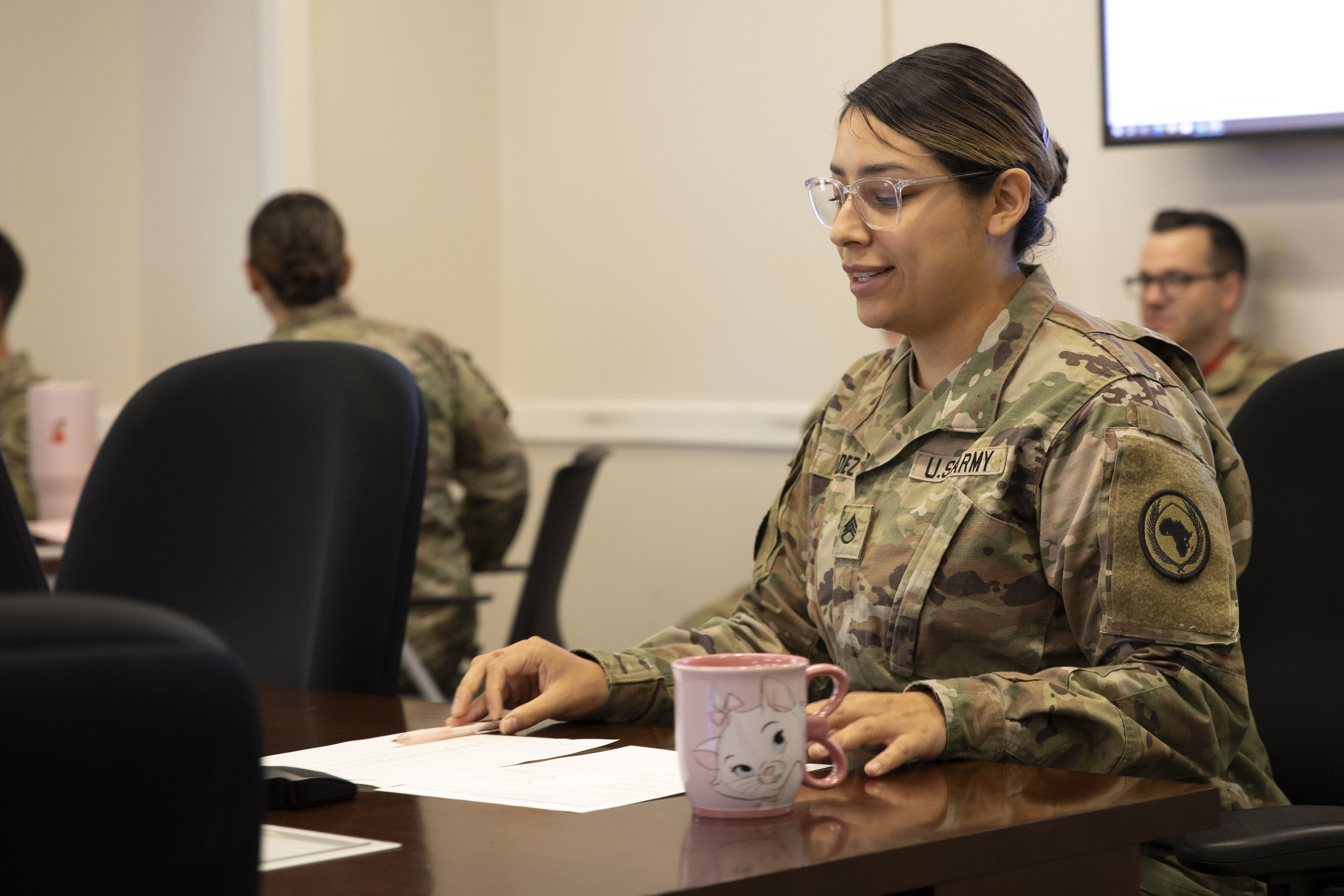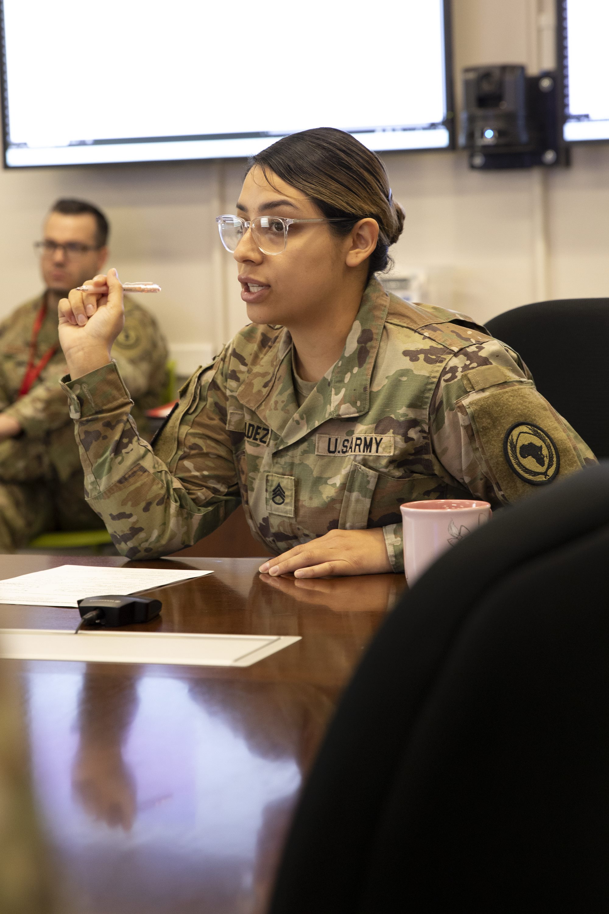 U.S. Army Staff Sgt. Jailene Valdez, Combined Joint Task Force-Horn of Africa administrative NCO in charge, leads an administrative meeting at Camp Lemonnier, Djibouti, on Feb 6, 2025. Valdez manages and organizes the policies and memos for the CJTF- HOA staff and manages the human resource team who ensured service