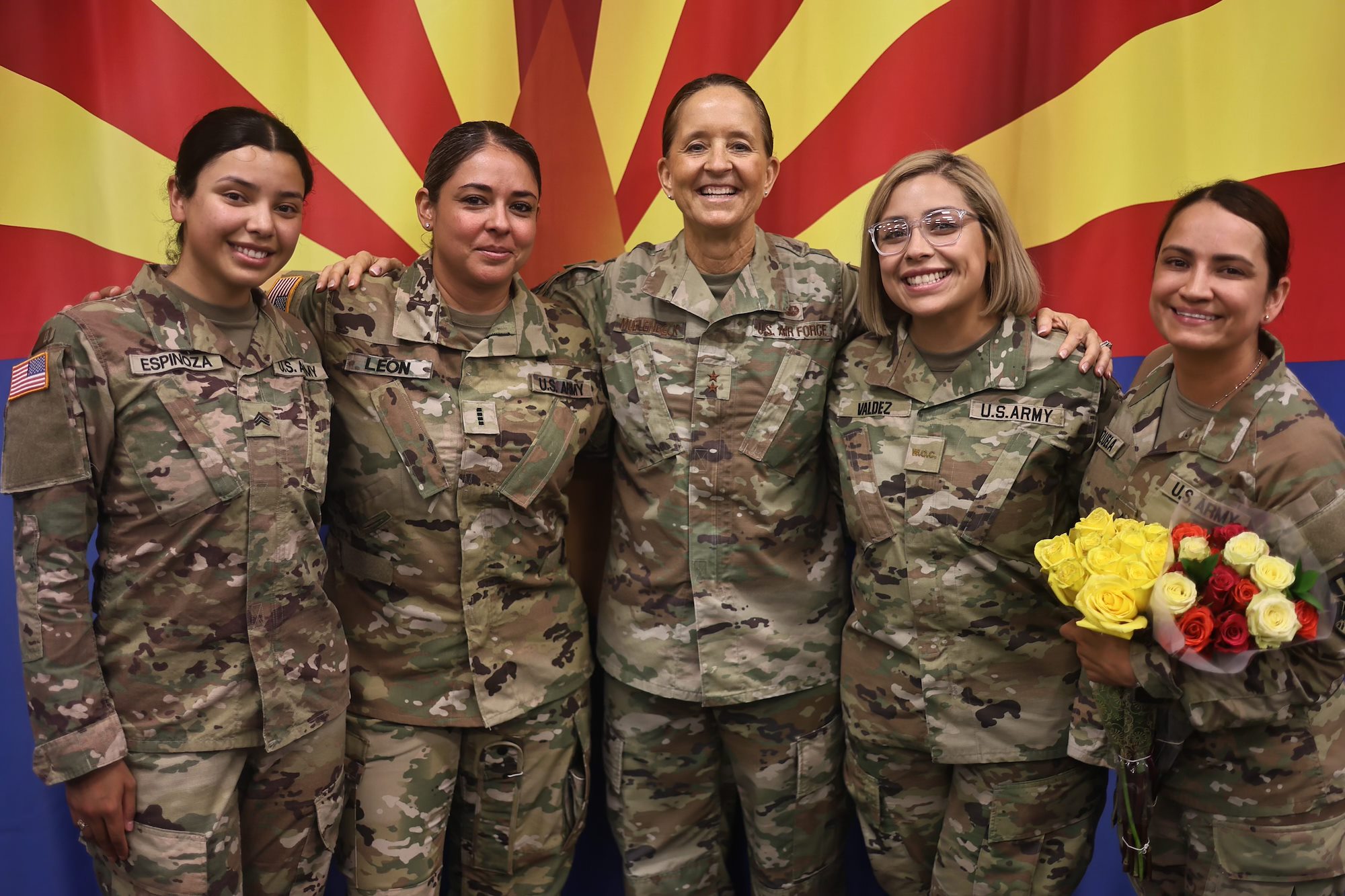 U.S. Army National Guard Maj. Gen. Kerry L. Meuhlenbeck, Arizona Adjutant General, center, stands with soldiers returning from deployment from Poland. U.S. Army Staff Sgt. Aileen Espenoza, Jailene Valdez’s sister, her friend Army Staff Sgt. Arlae Valenzuela and Chief Warrant Officer 4 Lupecelia Leon, influenced Valdez to become a warrant officer and cheered her on through her candidacy. The photo depicts U.S. Army Staff Sgt. Jailene Valdez to highlight her Warrant Officer journey in Combined Joint Task Force-Horn of Africa’s Humans of HOA feature. (Courtesy photo)