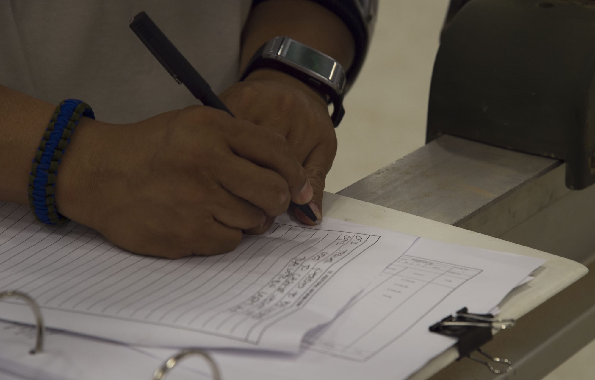 A Kellogg, Brown and Root contractor writes down cargo measurements during a joint inspection training practical demonstration performance evaluation July 28, 2016, at Camp Lemonnier, Djibouti. The week-long course taught the KBR contractors about the JI process and governing directives, as well as providing additional information about ensuring cargo is safe for loading onto an aircraft. (U.S. Air Force photo by Staff Sgt. Eric Summers Jr./Released)
