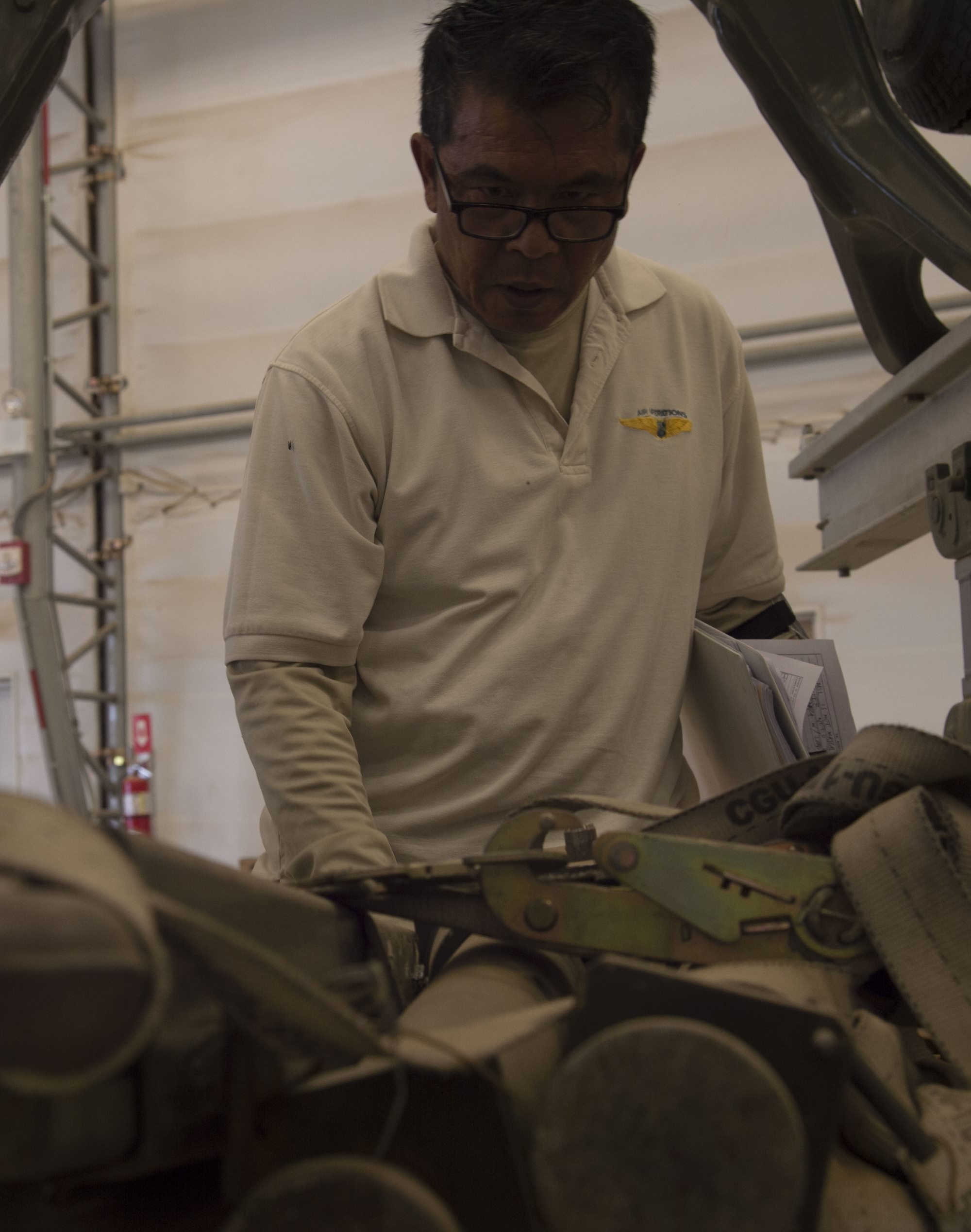 Jesus Rabago, a Kellogg, Brown and Root contractor and Joint Inspection training student, checks to ensure cargo is properly strapped down and held in place during the JI practical demonstration performance evaluation July 28, 2016, at Camp Lemonnier, Djibouti. The week-long course taught the KBR contractors about the JI process and governing directives, as well as providing additional information about ensuring cargo is safe for loading onto an aircraft. (U.S. Air Force photo by Staff Sgt. Eric Summers Jr./Released)