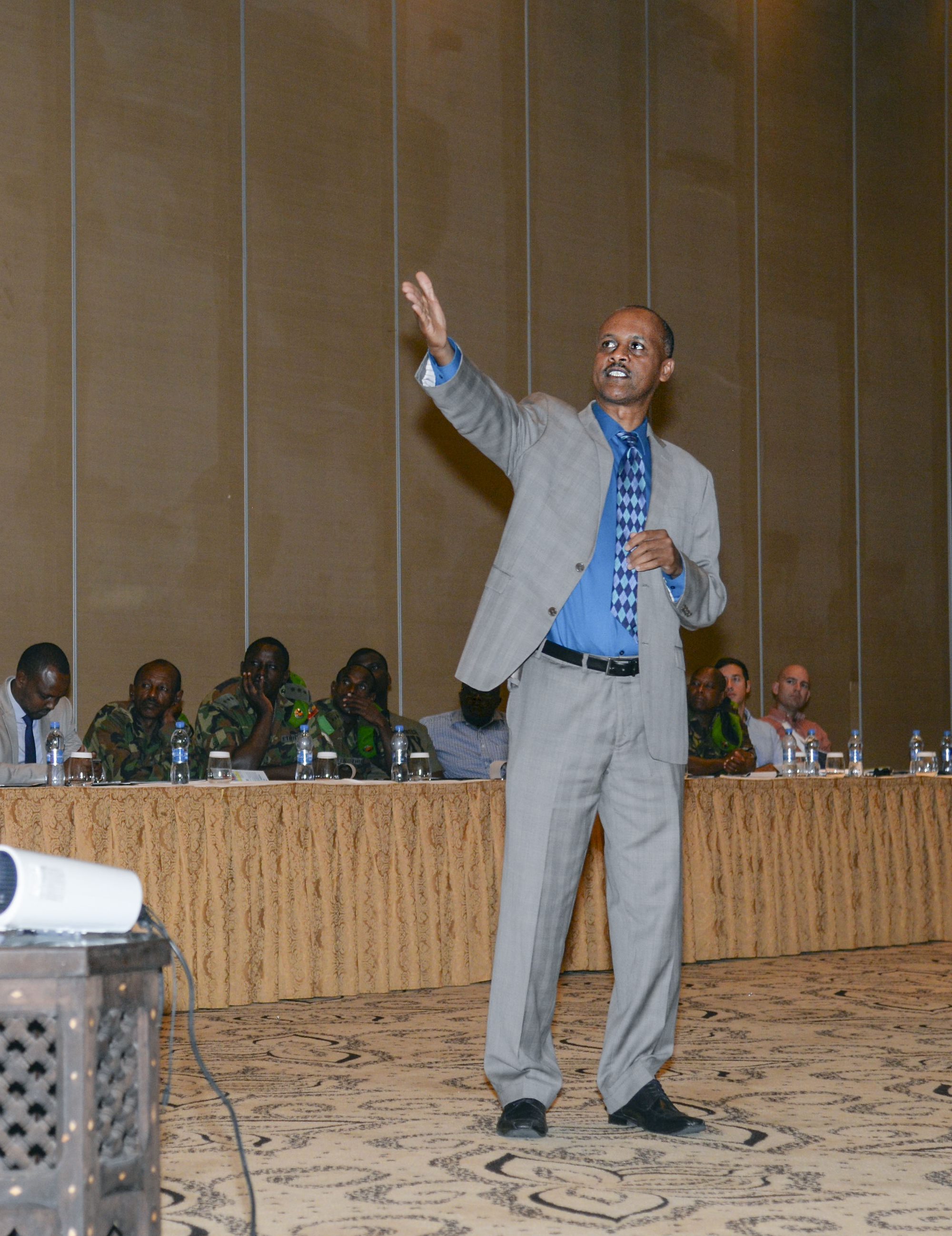 Abdulhalim Rijaal, U.S. Department of State program manager for East Africa, gives a speech at the fifth East Africa Public Information Officer’s Conference in Djibouti, Aug. 3, 2016. One of Rijaal’s goals during the conference was to learn from his African Union Mission to Somalia partners what is happening in each sector of Somalia. (U.S. Air Force photo by Staff Sgt. Benjamin Raughton/Released)