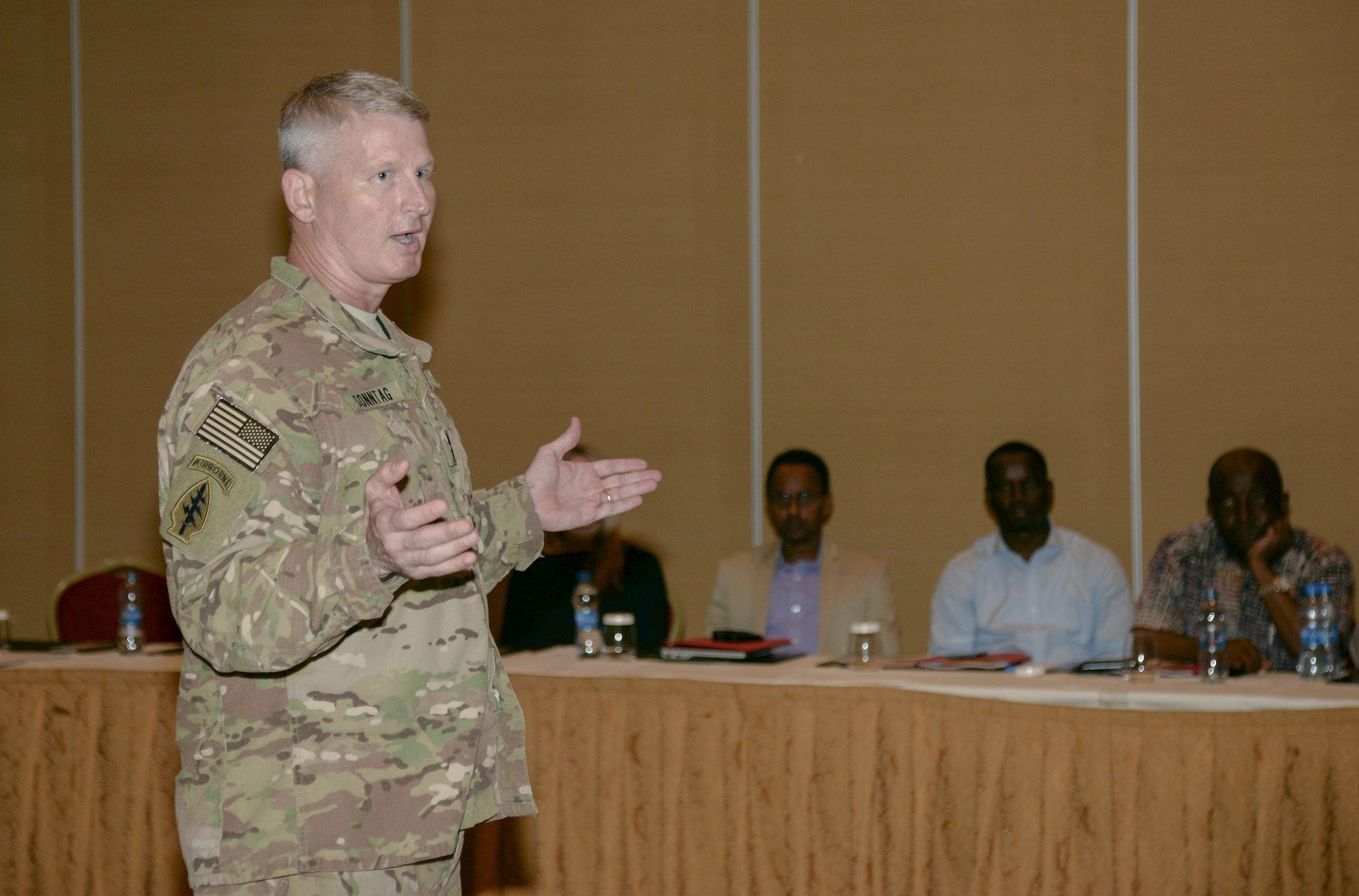 Maj. Gen. Kurt L. Sonntag, Combined Joint Task Force-Horn of Africa commander, gives closing remarks at the fifth iteration of the East Africa Public Information Officer’s Conference in Djibouti, Aug. 4, 2016. The conference brought together more than 35 PIOs from key regional partners to exchange best practices and lessons learned, identify challenges and strategies to address them, and to identify opportunities for greater coordination and collaboration. Topics of discussion ranged from countering violent extremism to effectively leveraging social media as a communications platform in Somalia. (U.S. Air Force photo by Staff Sgt. Benjamin Raughton/Released)