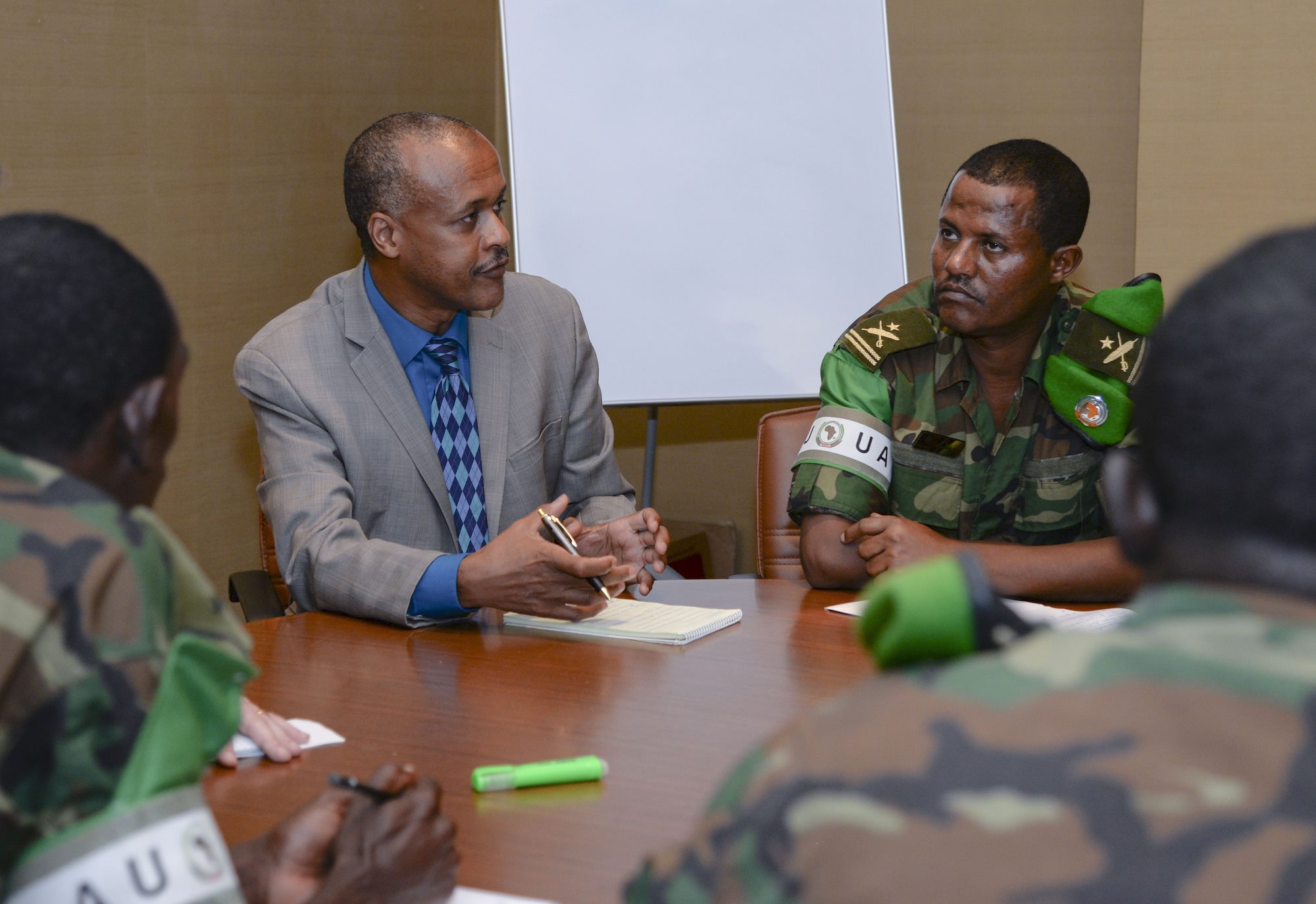 A member of the African Union Mission to Somalia attends a small group meeting during the fifth Public Information Officer’s Conference in Djibouti, Aug. 3, 2016. The conference brought together more than 35 PIOs from key regional partners to exchange best practices and lessons learned, identify challenges and strategies to address them and to identify opportunities for greater coordination and collaboration. Topics of discussion ranged from countering violent extremism to effectively leveraging social media as a communications platform in Somalia. (U.S. Air Force photo by Staff Sgt. Benjamin Raughton/Released)
