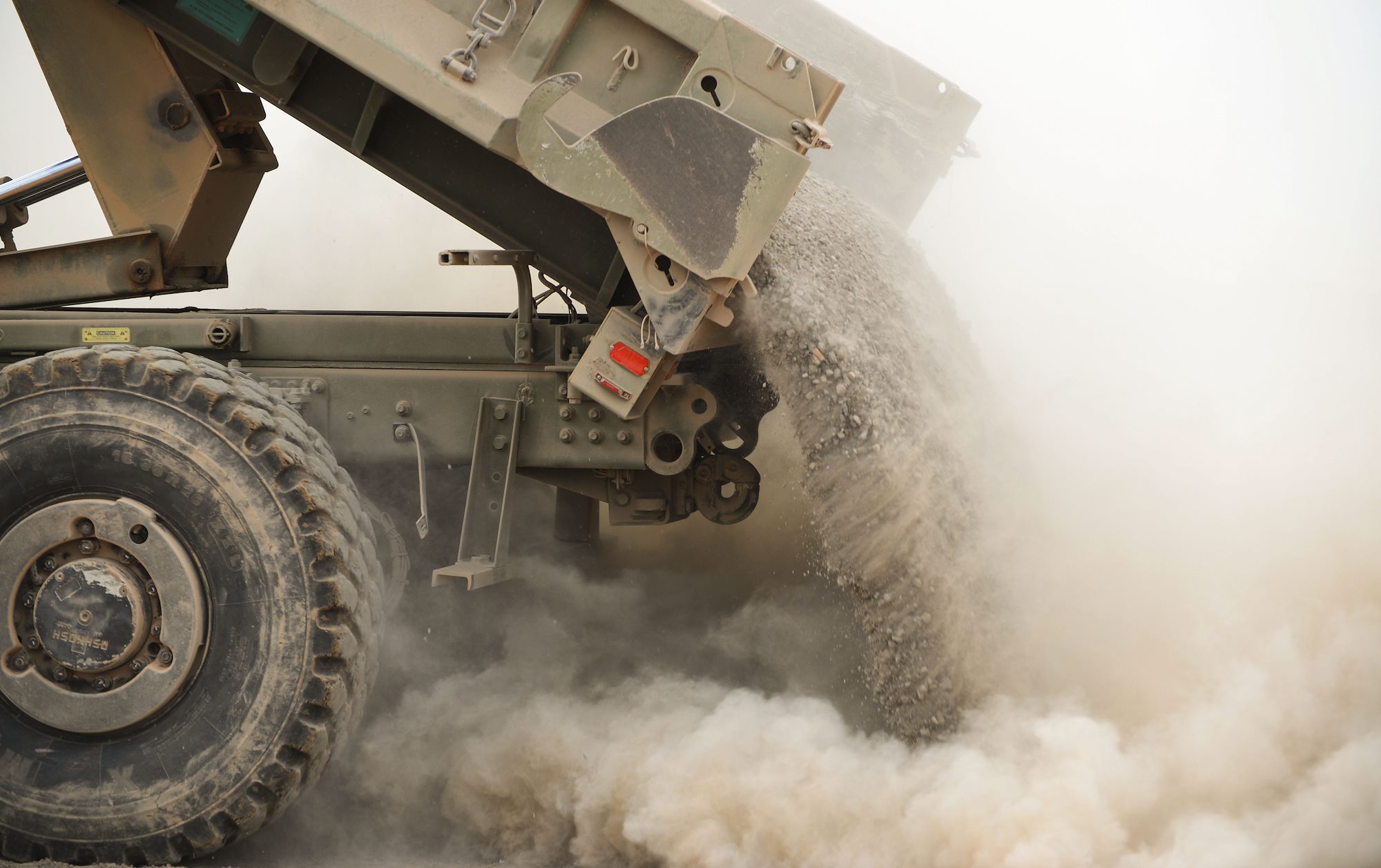 A dump truck releases gravel onto the ground to further construction of a parking pad at a Djibouti Airfield, July 28, 2016. Logistical delays, such as gravel delivery, occasionally delayed construction, but the Seabees completed the project ahead of schedule. (U.S. Air Force photo by Staff Sgt. Benjamin Raughton/Released)