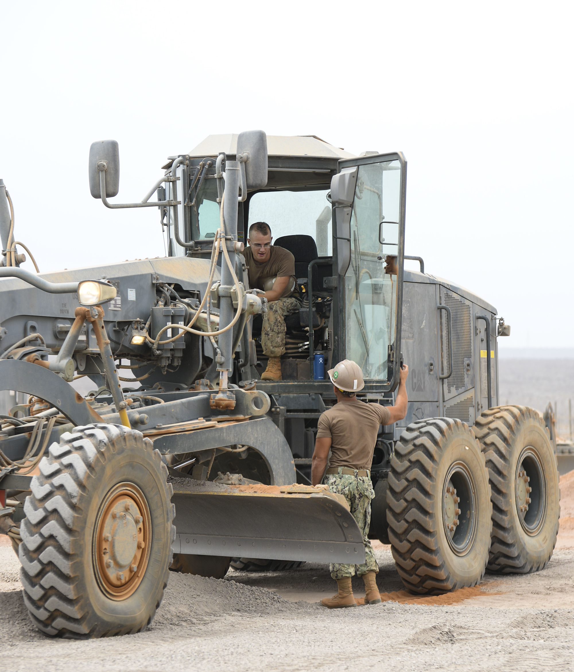Petty Officer 3rd Class Collins Scheffer, Naval Mobile Construction Battalion 133 heavy equipment operator, left, talks to Petty Officer 2nd Class Christian Rivera, NMCB 22 heavy equipment operator, while operating a grader during construction of a parking pad at a Djibouti airfield, July 28, 2016. The grader is used to evenly spread gravel to a three-inch height during construction. (U.S. Air Force photo by Staff Sgt. Benjamin Raughton/Released)