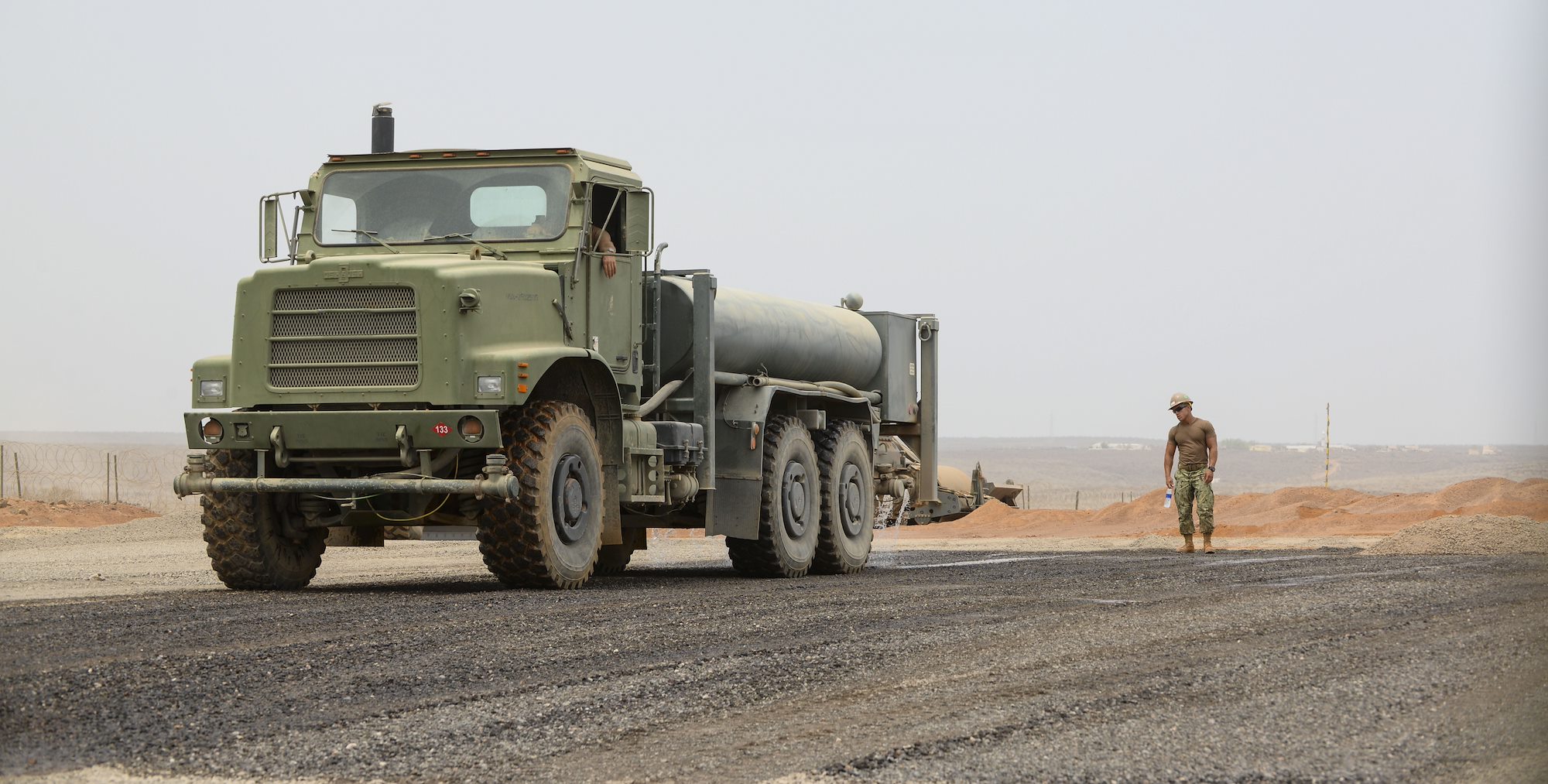 Petty Officer 2nd Class Tom Ross, Naval Mobile Construction Battalion 22 heavy equipment operator, drives a water truck over a gravel parking pad while Petty Officer 2nd Class Christian Rivera, NMCB 22 heavy equipment operator and team lead, watches his work at a Djibouti airfield, July 28, 2016. The water fell through the gravel, further compacting the surface and reducing dust. (U.S. Air Force photo by Staff Sgt. Benjamin Raughton/Released)