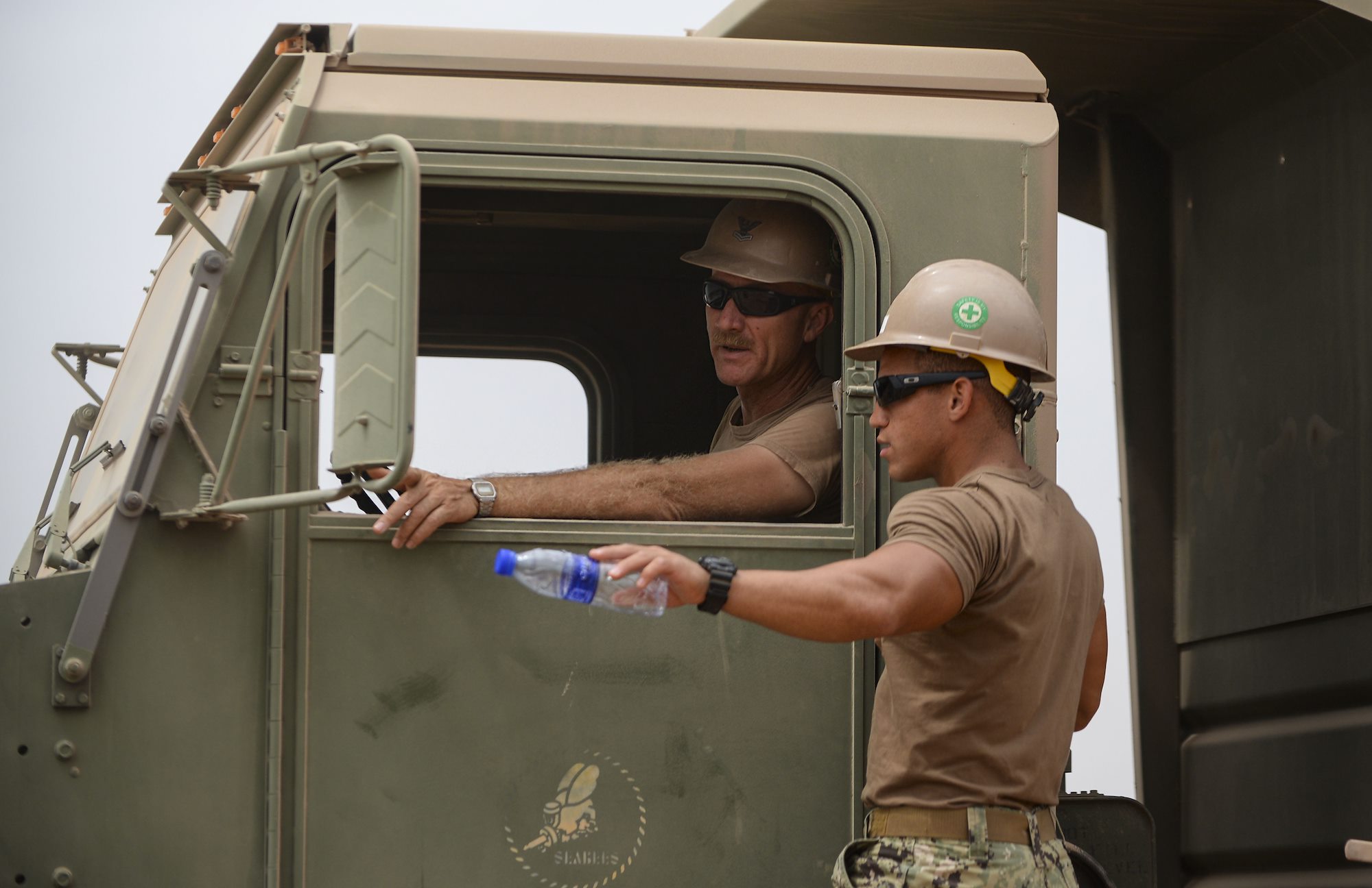 Petty Officer 2nd Class Tom Ross, Naval Mobile Construction Battalion 22 heavy equipment operator, left, talks to Petty Officer 2nd Class Christian Rivera, NMCB 22 heavy equipment operator during construction of a parking pad at a Djibouti airfield, July 28, 2016. During construction, land was flattened, gravel was laid evenly, flattened again and covered with water to increase density and reduce dust. (U.S. Air Force photo by Staff Sgt. Benjamin Raughton/Released)