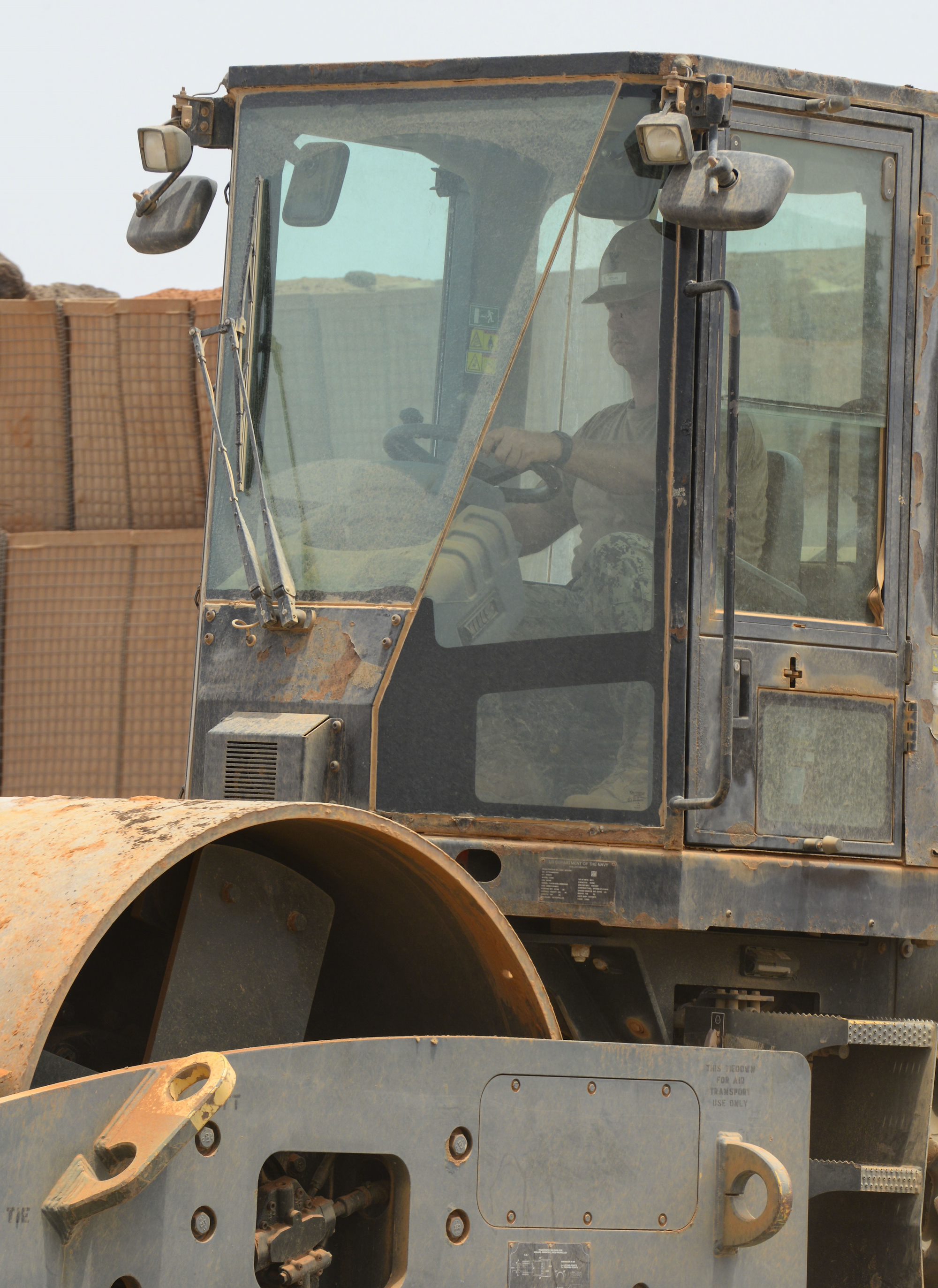 Petty Officer 1st Class Joseph Peters, Naval Mobile Construction Battalion 133 heavy equipment operator, drives a roller over gravel during construction of a parking pad at a Djibouti Airfield, July 28, 2016. The project included parking pads for multiple vehicles and a road that allows fire trucks and emergency crews quicker access to different parts of the airfield, thereby cutting down critical response time. (U.S. Air Force photo by Staff Sgt. Benjamin Raughton/Released)