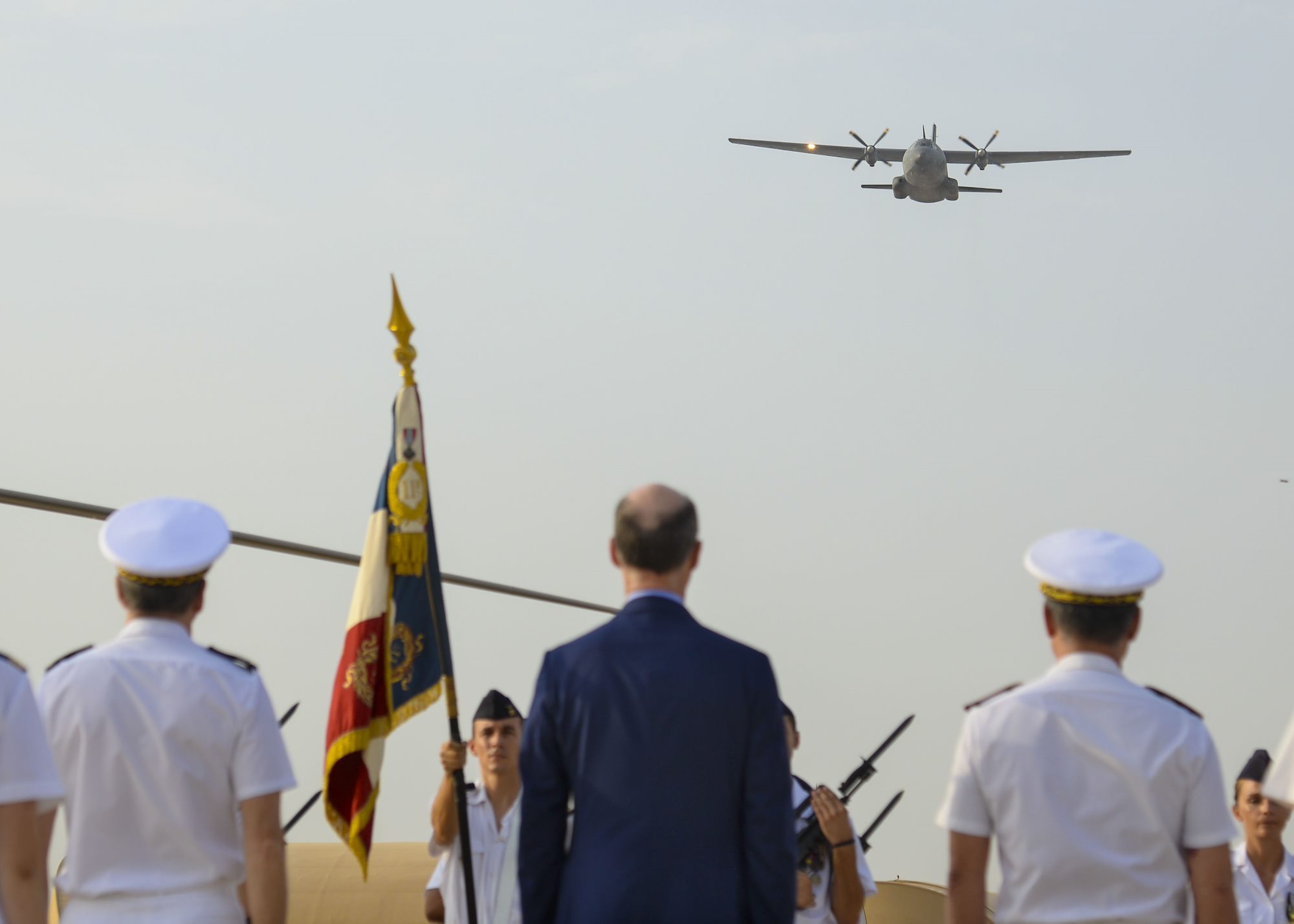 French Ambassador to Djibouti Christophe Guilhou, center, watches a C-160 Transall fly overhead at the Bastille Day Ceremony on the French base in Djibouti, July 14, 2016. The C-160 flyover was accompanied by two French 2000-5 Mirages. Also commonly referred to as French National Day, Bastille Day is an annual celebration of French unity that began one year after the storming of the Bastille in 1789. France established its presence in Djibouti (then called Protectorate of Obock) in the 1880s. (U.S. Air Force photo by Staff Sgt. Benjamin Raughton/Released)